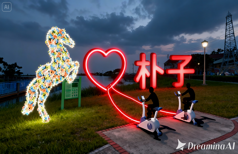 2026及馬造型燈組作品採用半浮雕式花燈結構,透過LED光源與投光燈設計,形成投影花影於地面,營造出光與影交織的動態美感。夜間亮燈後,紅光與花影交融,象徵幸福光照樸城、萬家團圓。