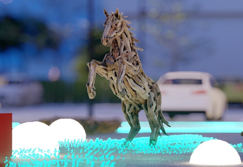 漂流木與金屬結構打造的風馳奔騰馬身,外覆燈光,象徵馬年力量與災後前進的生命力。