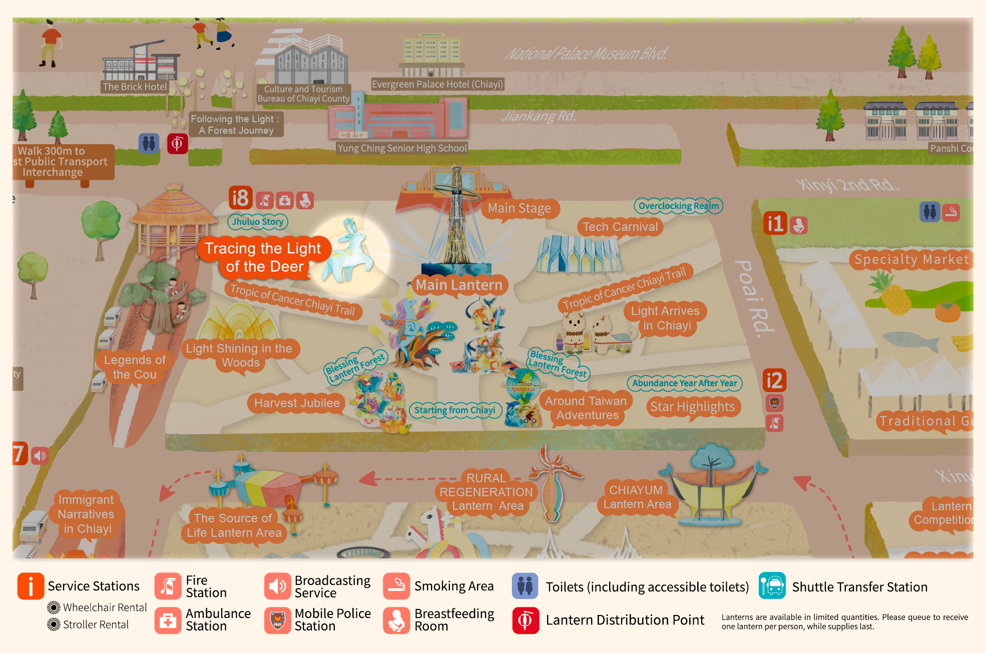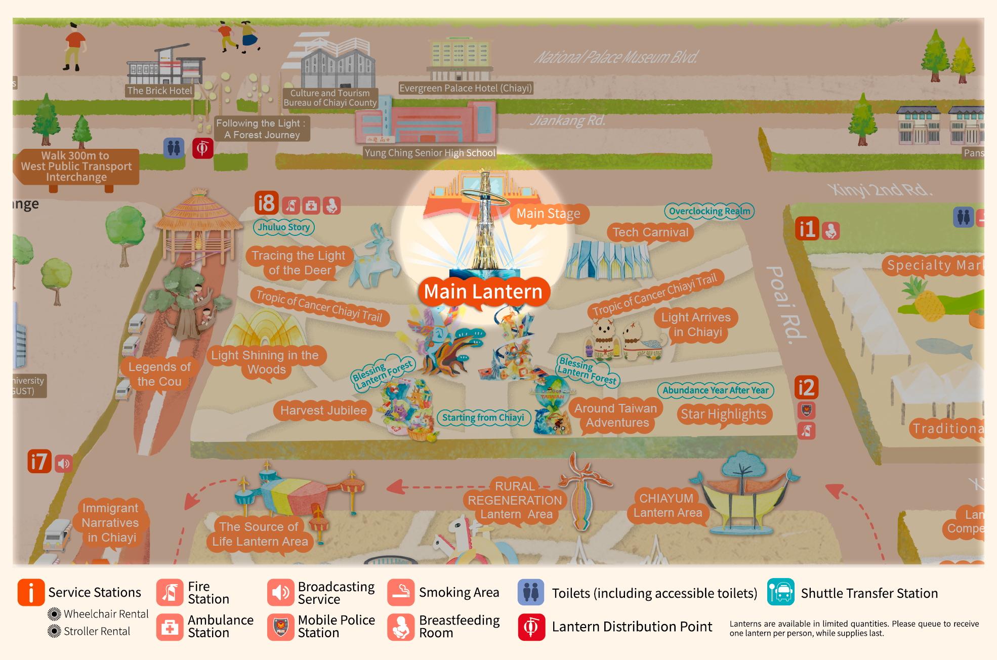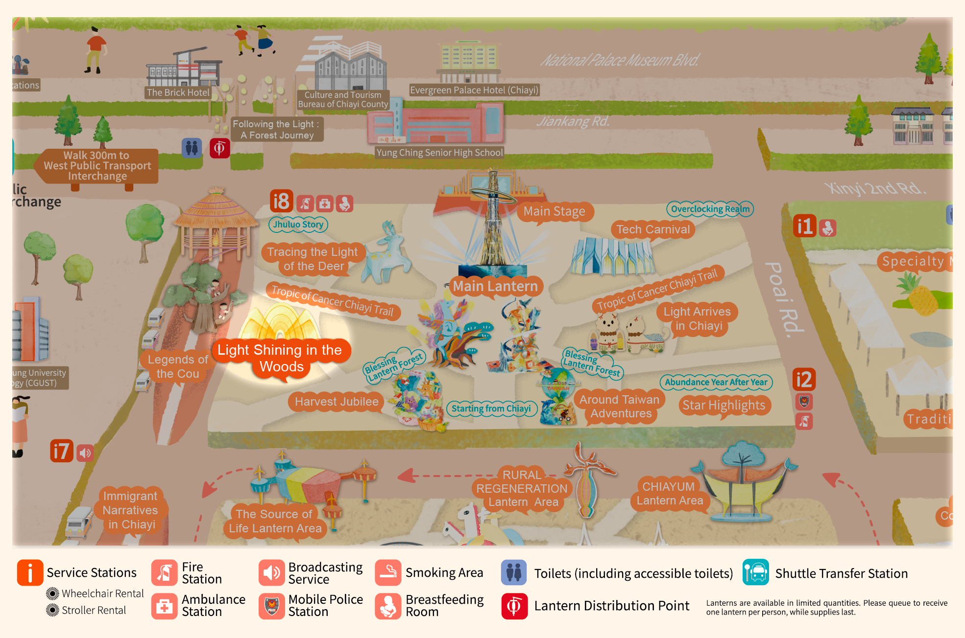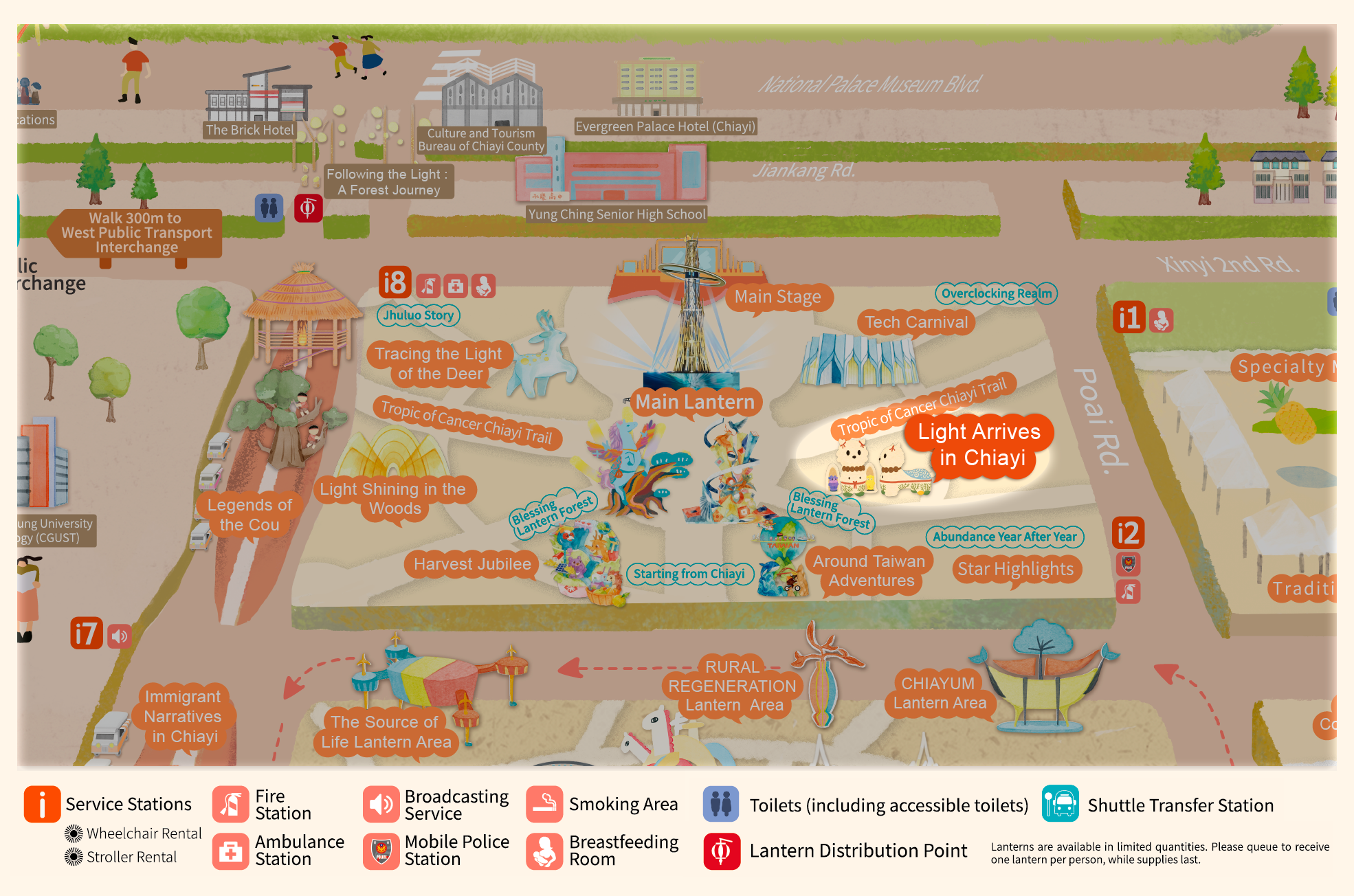 • With "Praying for Light, Dancing Clouds, Celebrating Abundant Harvest" as the curatorial axis, and extending the theme "Leaping Light Taiwan, Illuminating Chiayi," this area draws inspiration from Alishan's natural landscapes, prayer culture, and urban innovative energy. It creates an immersive field of light described as "Wishing from the Sea of Clouds, Poeticizing with Light." Through the flow of light, layers of color, and rhythmic beats, it connects the Main Lantern, the Blessing Lantern Forest, and the seven major theme zones.