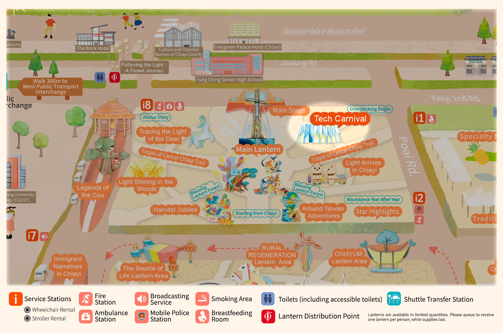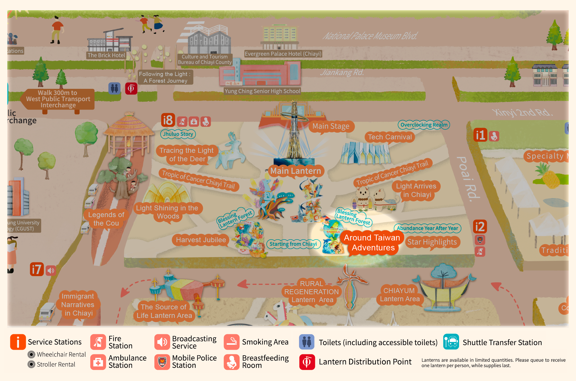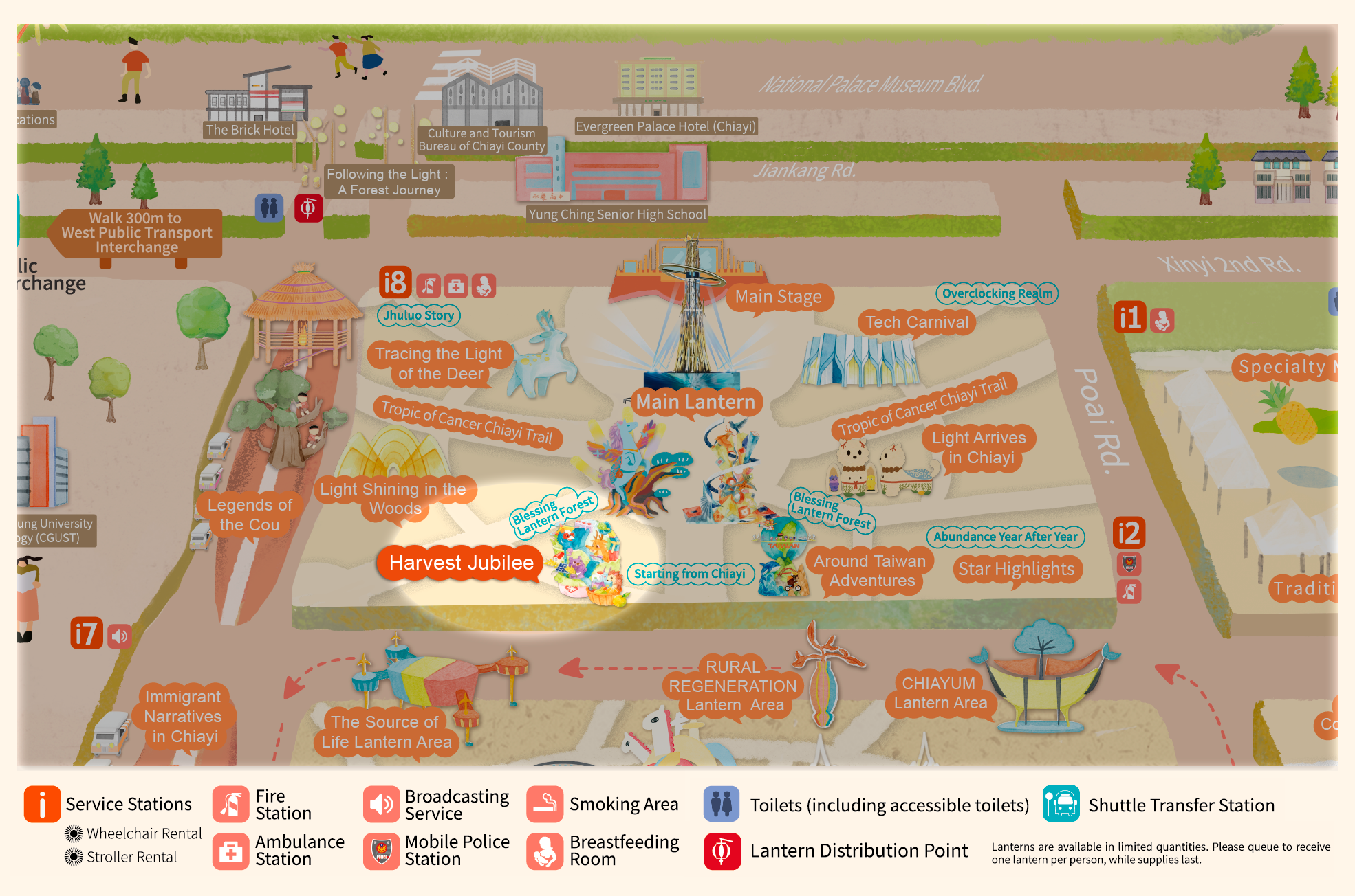 • With "Praying for Light, Dancing Clouds, Celebrating Abundant Harvest" as the curatorial axis, and extending the theme "Leaping Light Taiwan, Illuminating Chiayi," this area draws inspiration from Alishan's natural landscapes, prayer culture, and urban innovative energy. It creates an immersive field of light described as "Wishing from the Sea of Clouds, Poeticizing with Light." Through the flow of light, layers of color, and rhythmic beats, it connects the Main Lantern, the Blessing Lantern Forest, and the seven major theme zones.