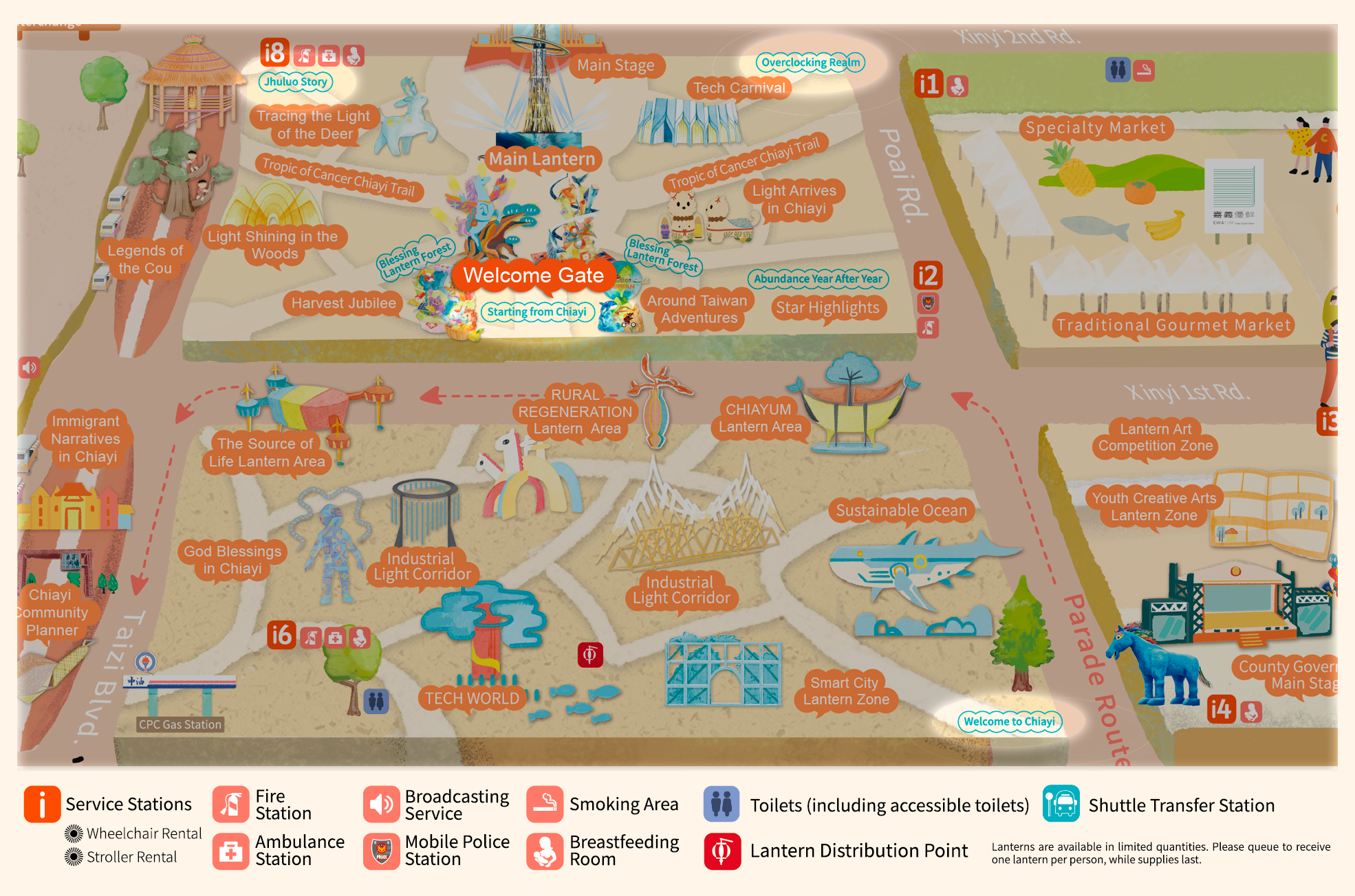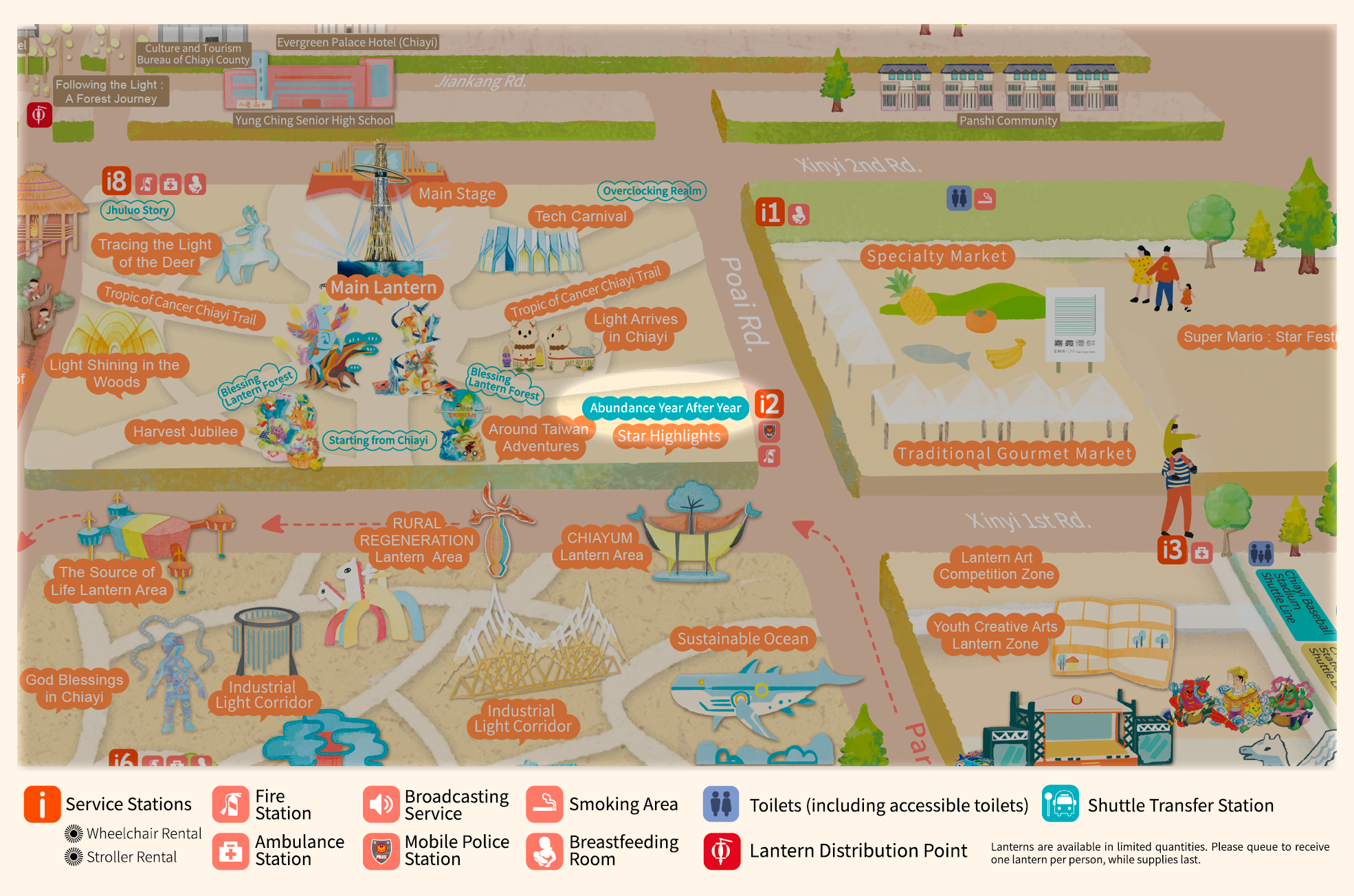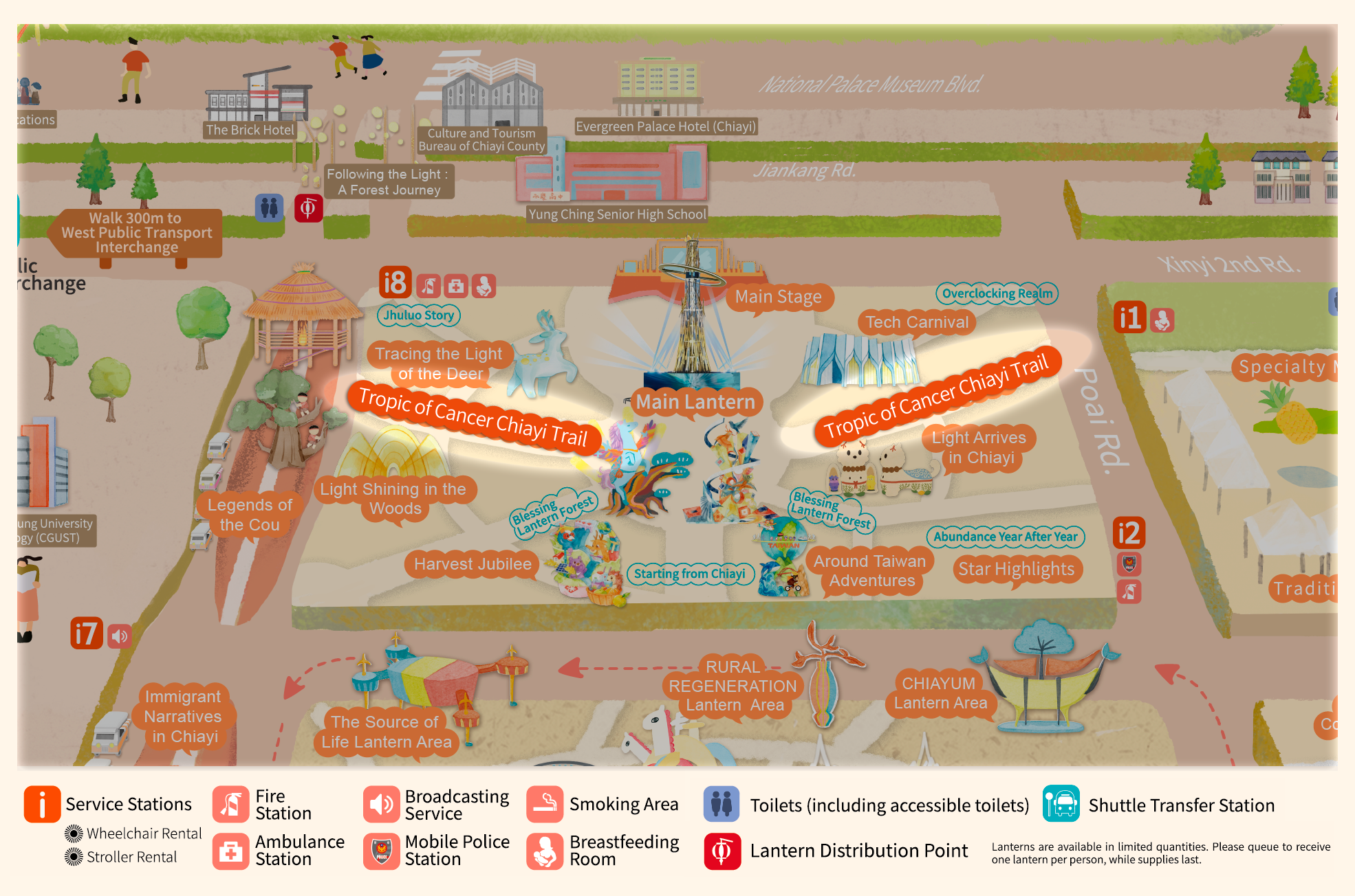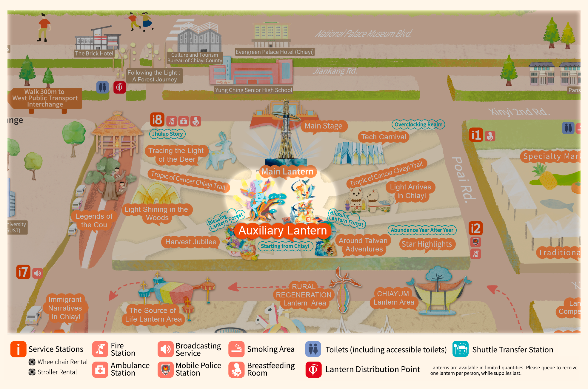 • With "Praying for Light, Dancing Clouds, Celebrating Abundant Harvest" as the curatorial axis, and extending the theme "Leaping Light Taiwan, Illuminating Chiayi," this area draws inspiration from Alishan's natural landscapes, prayer culture, and urban innovative energy. It creates an immersive field of light described as "Wishing from the Sea of Clouds, Poeticizing with Light." Through the flow of light, layers of color, and rhythmic beats, it connects the Main Lantern, the Blessing Lantern Forest, and the seven major theme zones.