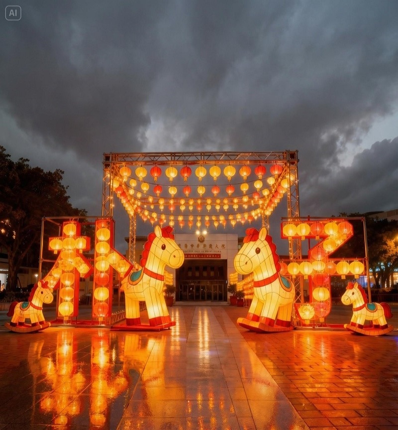 The 2026 Puzi Lantern Festival takes place at the plaza in front of the District Office as its main venue, integrating local culture, humanistic character, and festive spirit. A vibrant illuminated corridor is created using TRUSS triangular structures combined with colorful lantern installations. Above the corridor, a banner reading “2026 Puzi Lantern Festival” is prominently displayed, while adorable Year of the Horse lanterns are positioned on both sides, symbolizing galloping horses and the arrival of happiness, and expressing Puzi’s dynamic momentum as it welcomes the New Year.