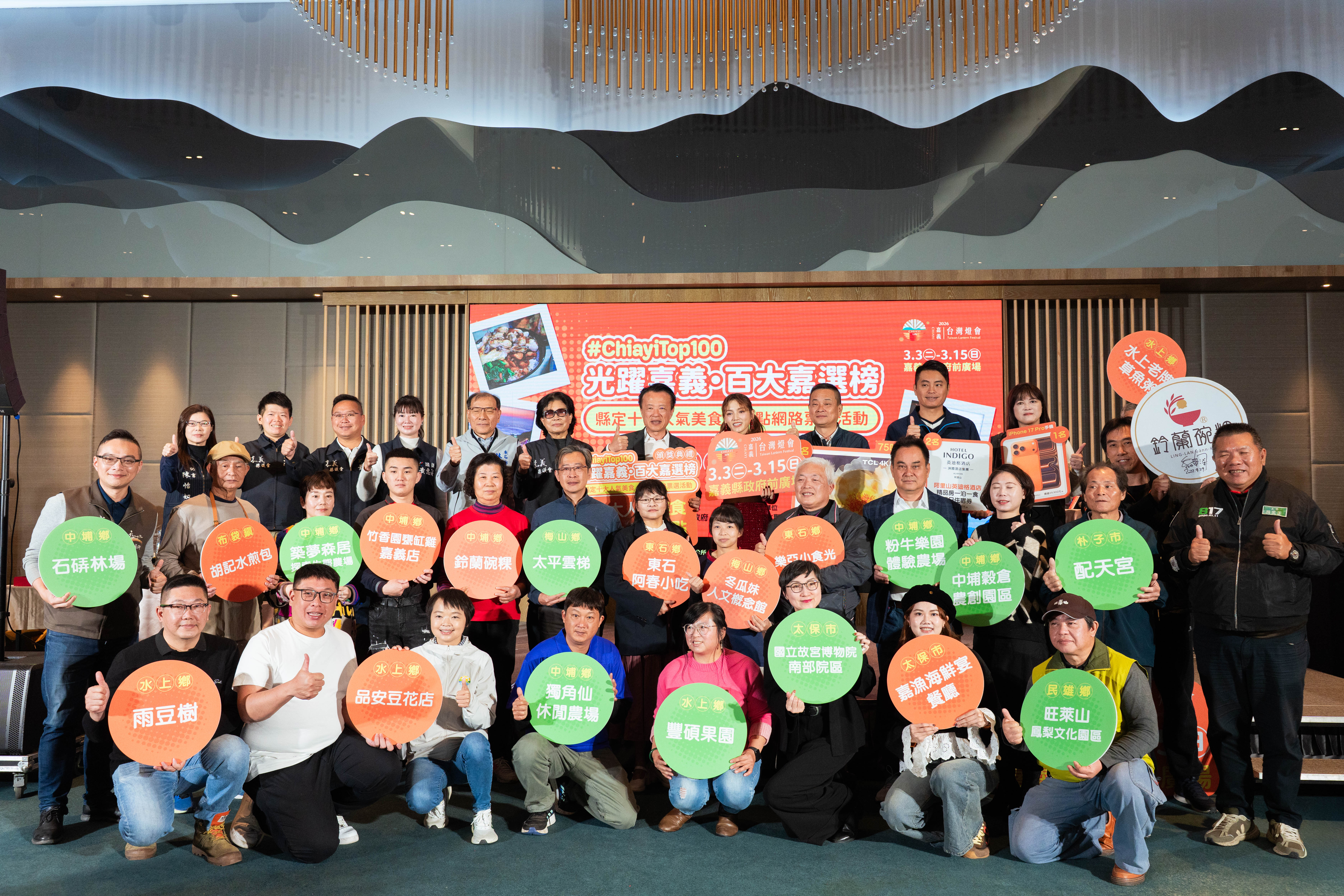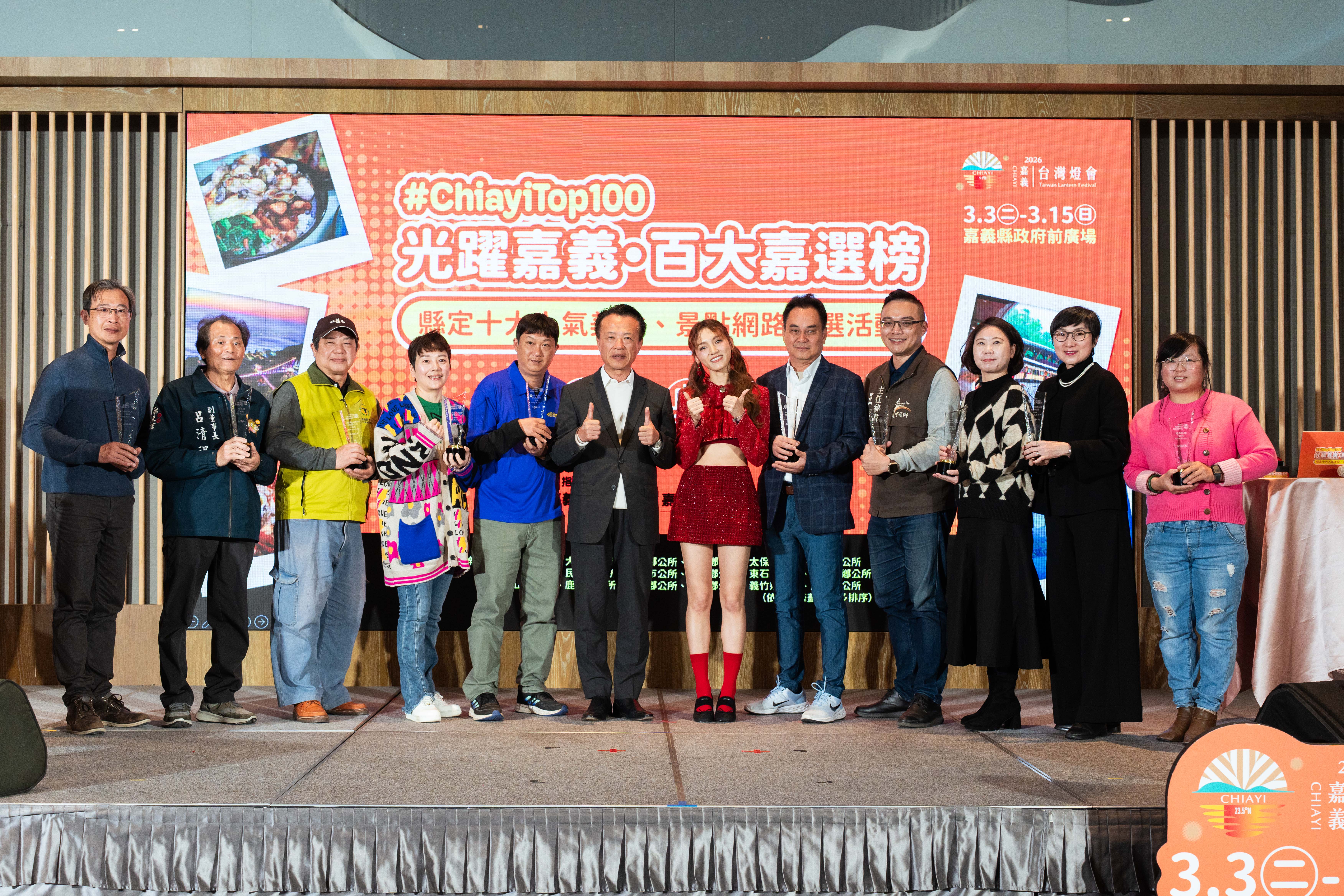 「光躍嘉義‧百大嘉選榜」網路票選活動結果出爐,縣府今9日在長榮文苑酒店舉辦頒獎典禮,由縣長翁章梁親自表揚「10大人氣美食」與「10大人氣景點」,並邀請活動代言人朵拉(Dora)與現場來賓一同見證榮耀榜單。