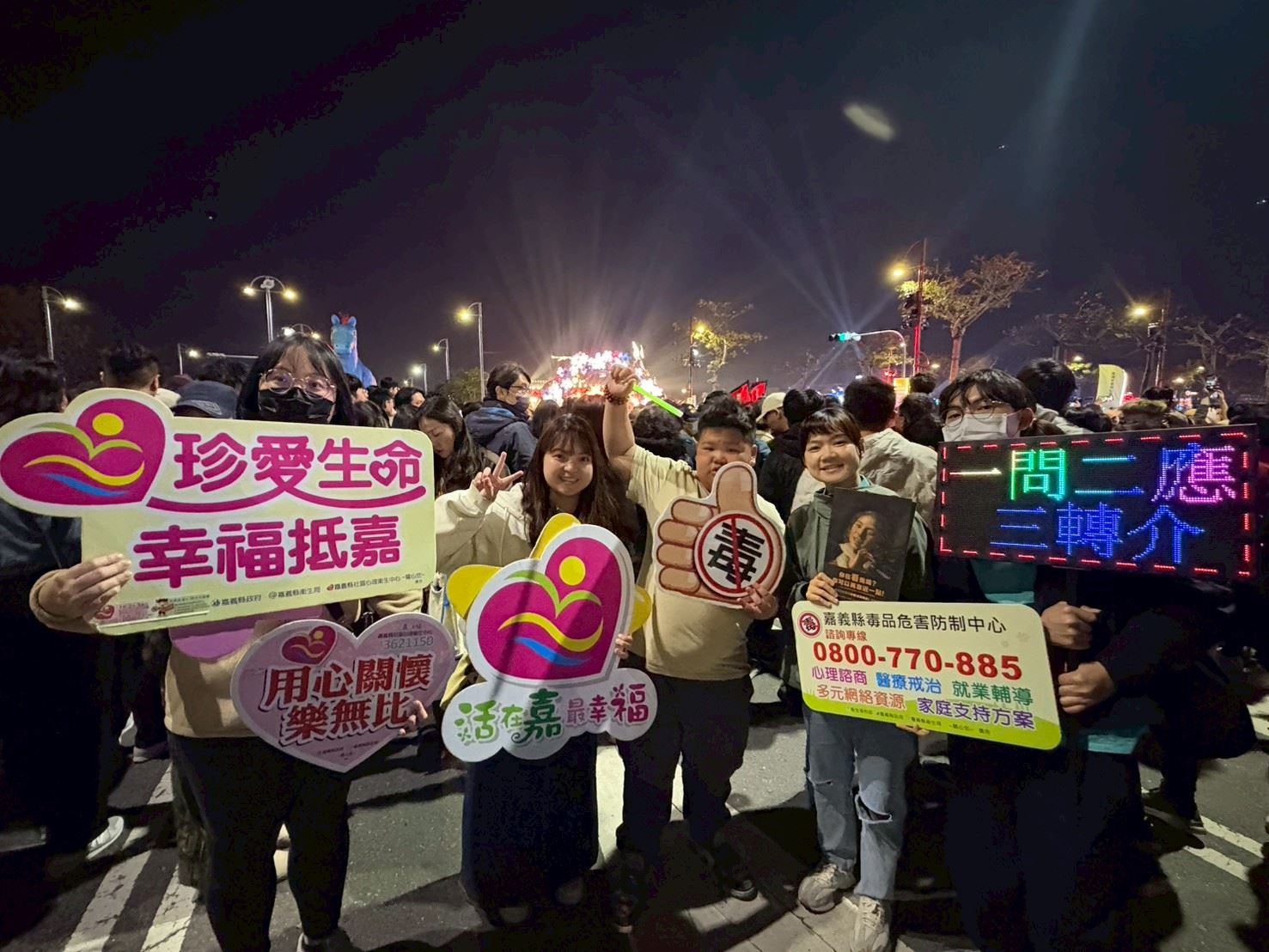 心理健康衛教隨開幕踩街及花車大遊行隊伍沿途宣導,並深入新住民、原住民及宗教燈區場域,主動與參與燈會民眾互動交流,推廣心理健康促進與珍愛生命守門人觀念,在璀璨燈海中展現溫暖關懷。