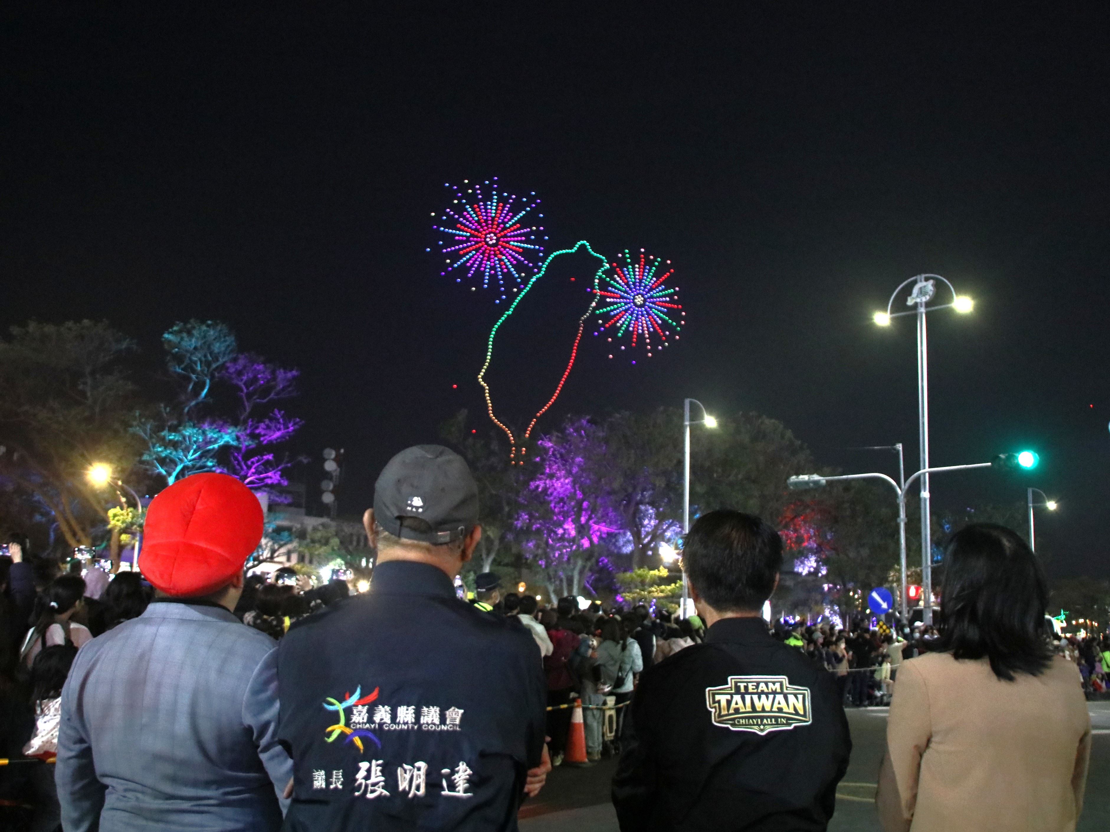 嘉義縣政府指出,2026台灣燈會以「光躍台灣・點亮嘉義」為主題,7日晚間的無人機秀與大遊行將這股展期熱度推向高峰,從夜空中向幕後英雄致敬,到街道上匯聚跨族群、跨世代、跨國界的遊行隊伍,展現嘉義承辦台灣燈會的熱情與能量,也讓民眾感受榮耀與希望交織的氛圍。