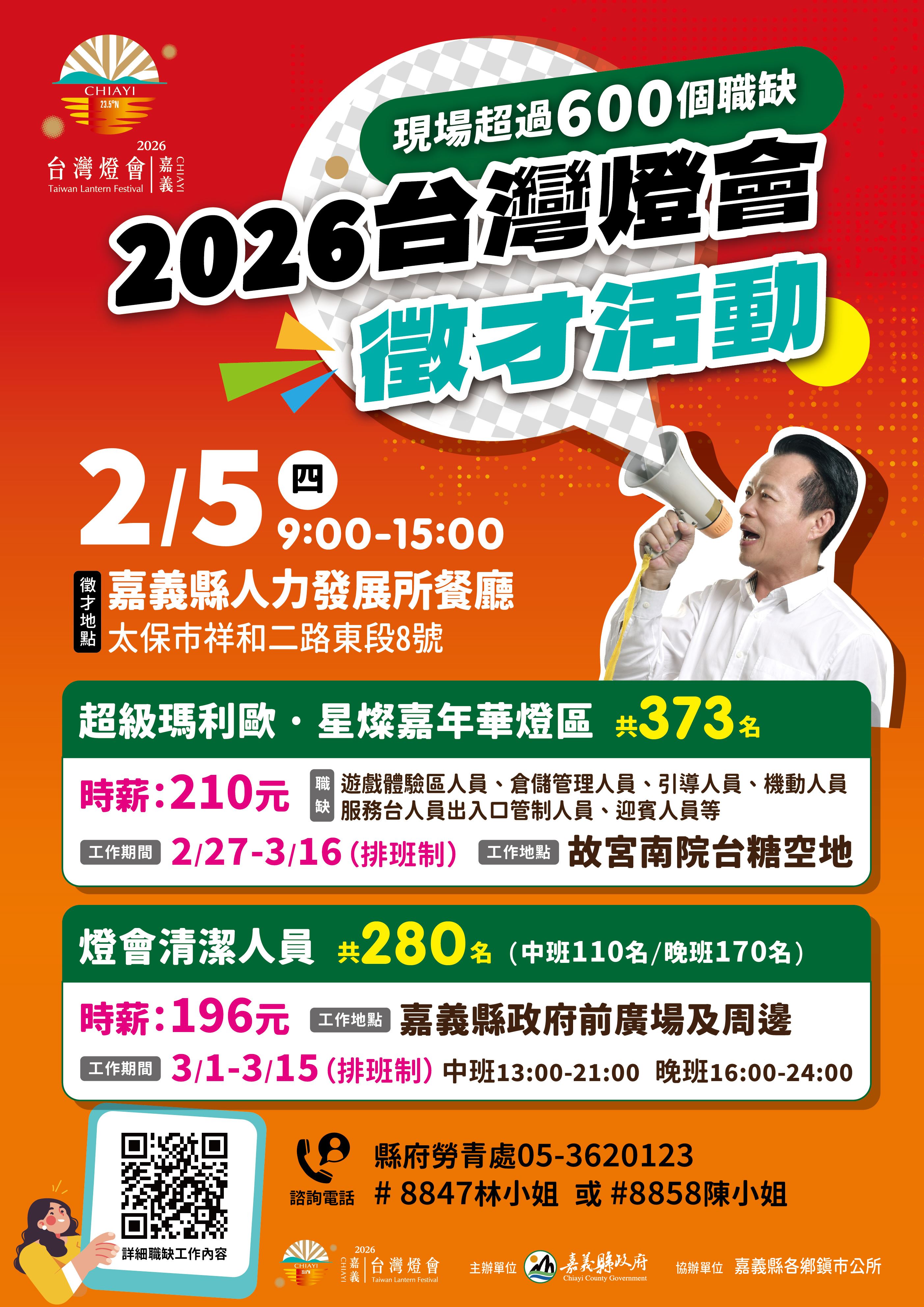 為迎接2026台灣燈會,嘉義縣政府將在2月5日(四)上午9點至下午3點於嘉義縣人力發展所舉辦專場徵才活動,釋出超過600個工作機會,歡迎鄉親朋友踴躍報名。