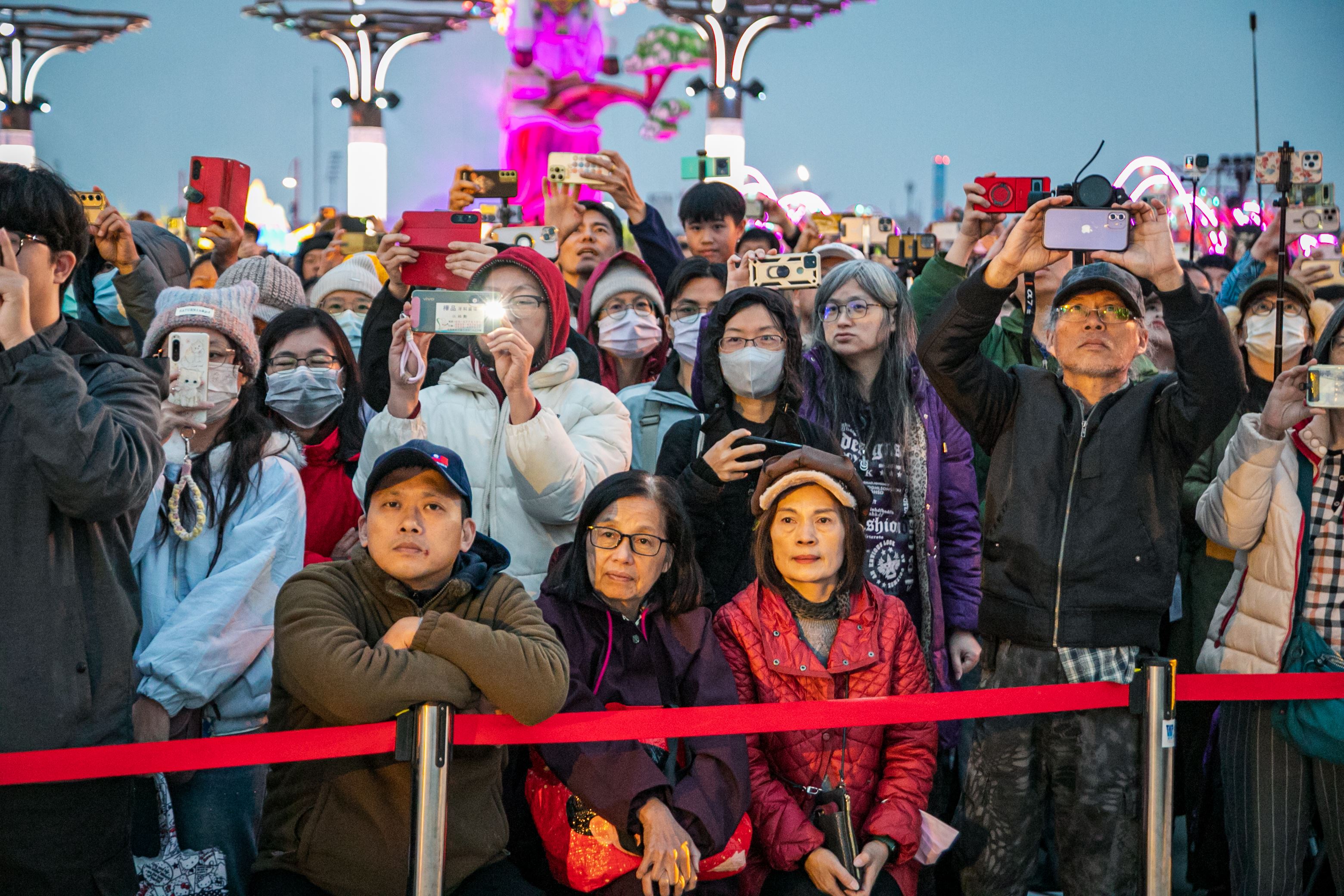 不少民眾特地提早到場卡位。謝小姐下午3點便抵達主舞台前排,完整欣賞整場表演,她表示看到橘色惡魔如此投入演出,自己也被現場氛圍感染,第一次看現場覺得非常精彩;林先生則說,特地下午請假前來燈會賞燈並觀看演出,下午5點左右舞台前已站滿人潮,可見橘色惡魔的人氣。