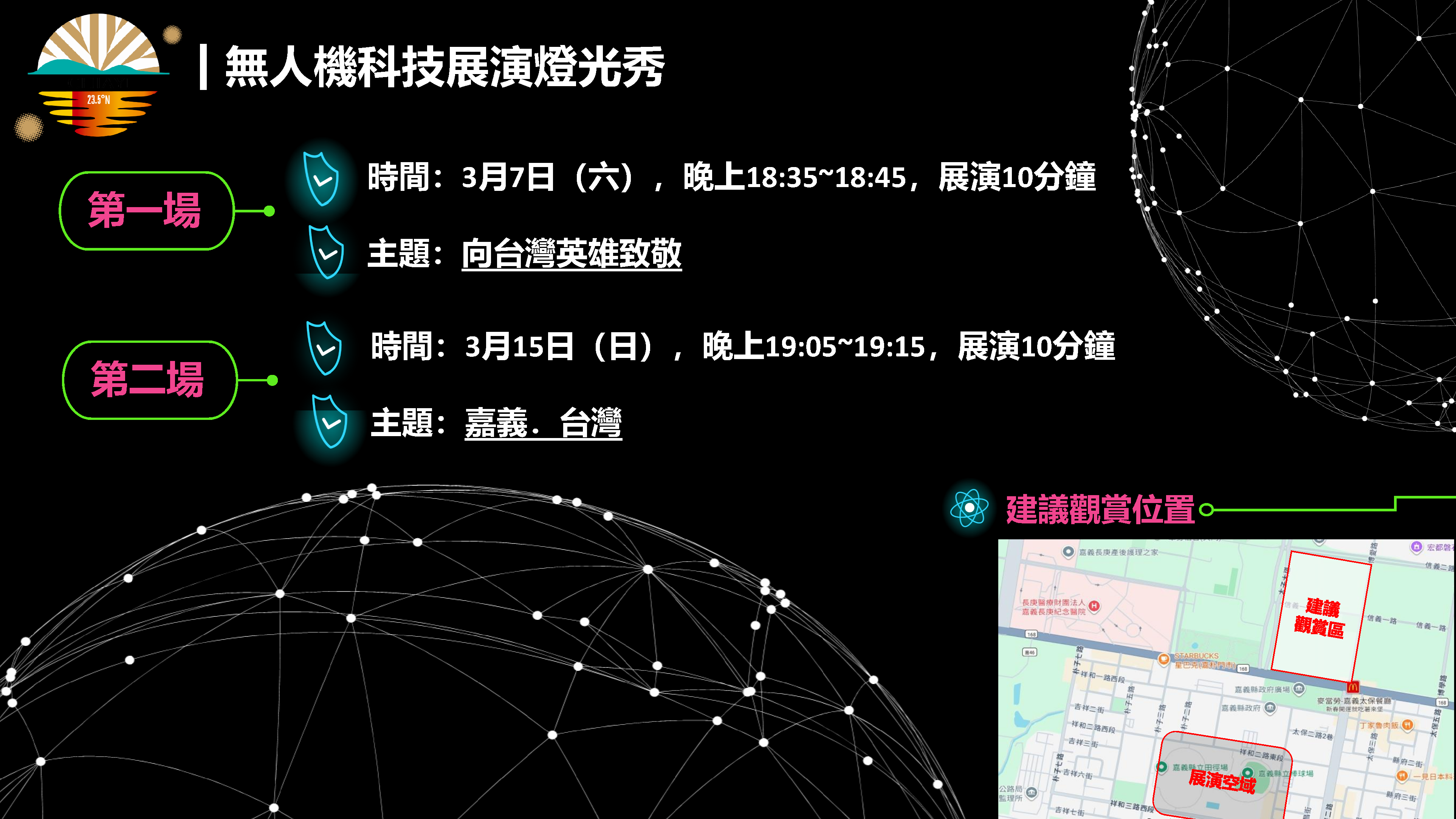 史上首次1,000架MIT無人機科技展演燈光秀就在「2026台灣燈會在嘉義」。燈會期間共計辦理2場,分別於3月7日及3月15日表演展出,第一場7日配合Team Taiwan大遊行,主題定為「向台灣英雄致敬」;15日配合燈會閉幕,定為「嘉義.台灣」。每場約10分鐘,最佳觀賞角度為面向縣府區域,歡迎民眾共同見證科技與藝術交織的精彩時刻。