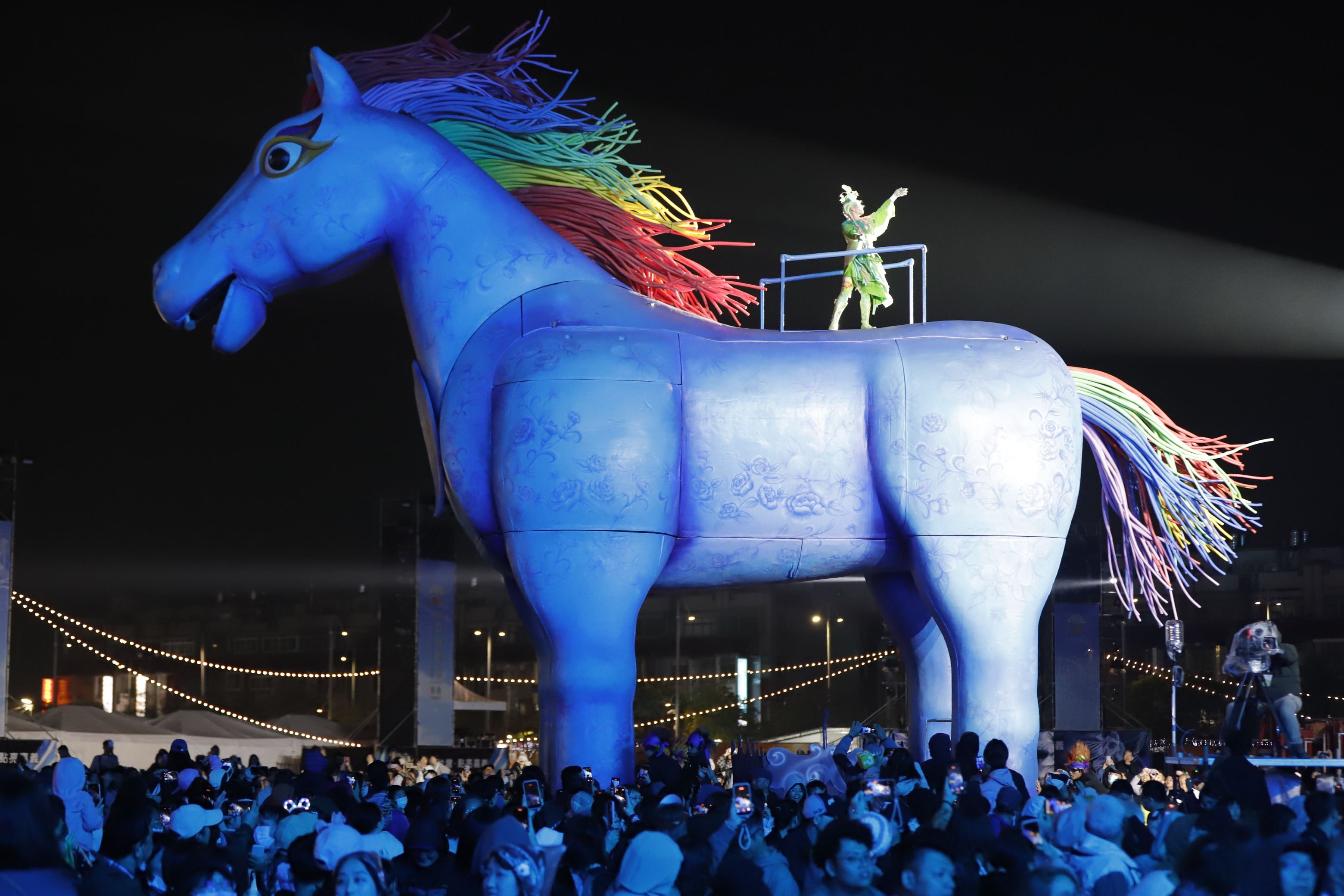 2026台灣燈會,紙風車劇團大型親子劇「雨馬」震撼演出,超過三層樓高的巨型藝術裝置踏著流動光影緩緩前行,彩虹鬃毛在夜色中閃耀奪目,結合舞台演出、火舞特效與沉浸式影像設計,為嘉義燈會增添驚喜與感動。