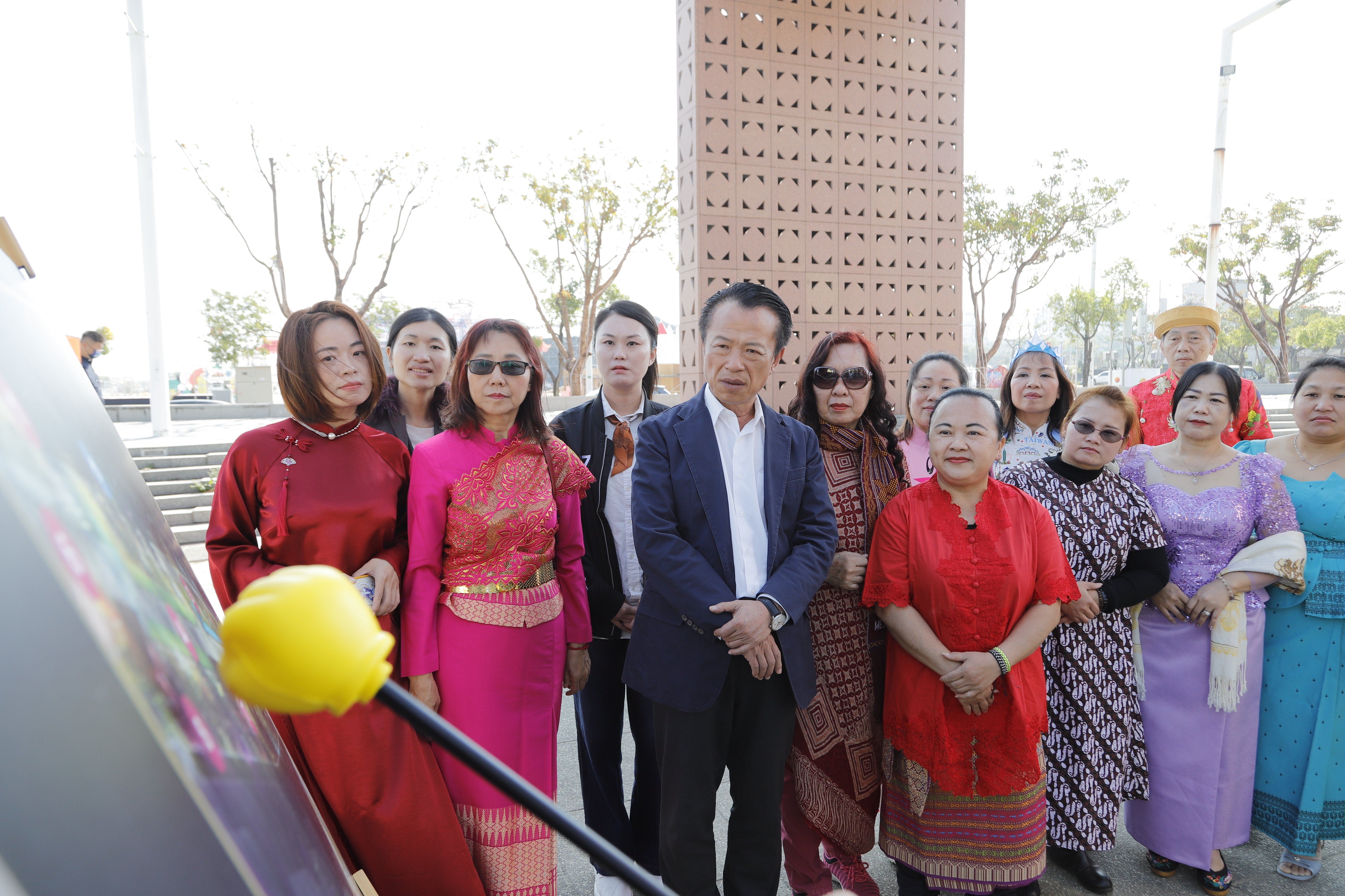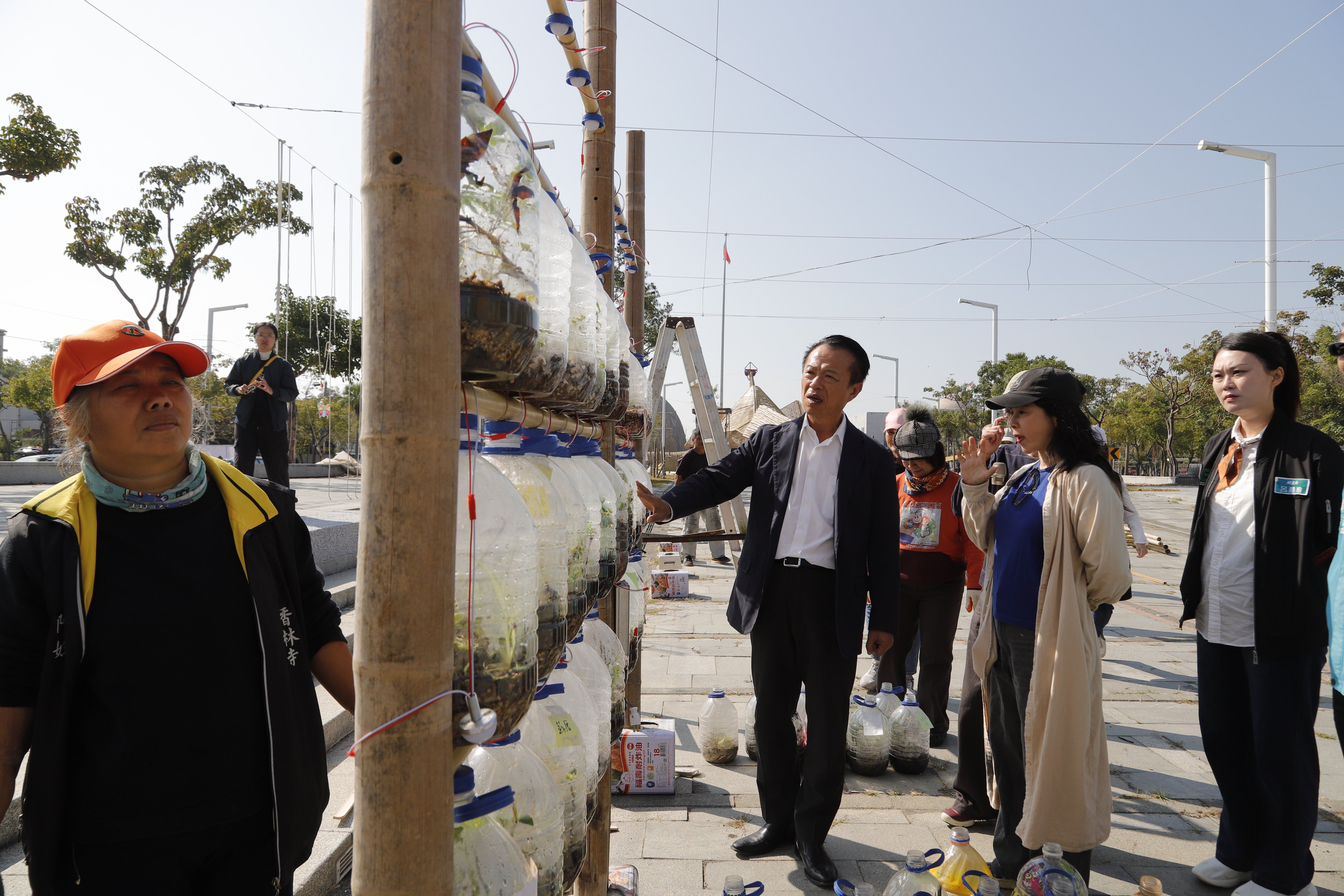 翁章梁走訪社規師、新住民燈區,首先於藍腹鷴燈組前邀翁縣長親自安裝一支有社規師共創詩句的竹筒燈,隨後由許芳瑜老師導覽燈區;新住民朋友則分享來台第一件帶來的物品或者最想念的物品,翁縣長與新住民共同將物件放上行囊的國度燈具,象徵迎接及點燈。