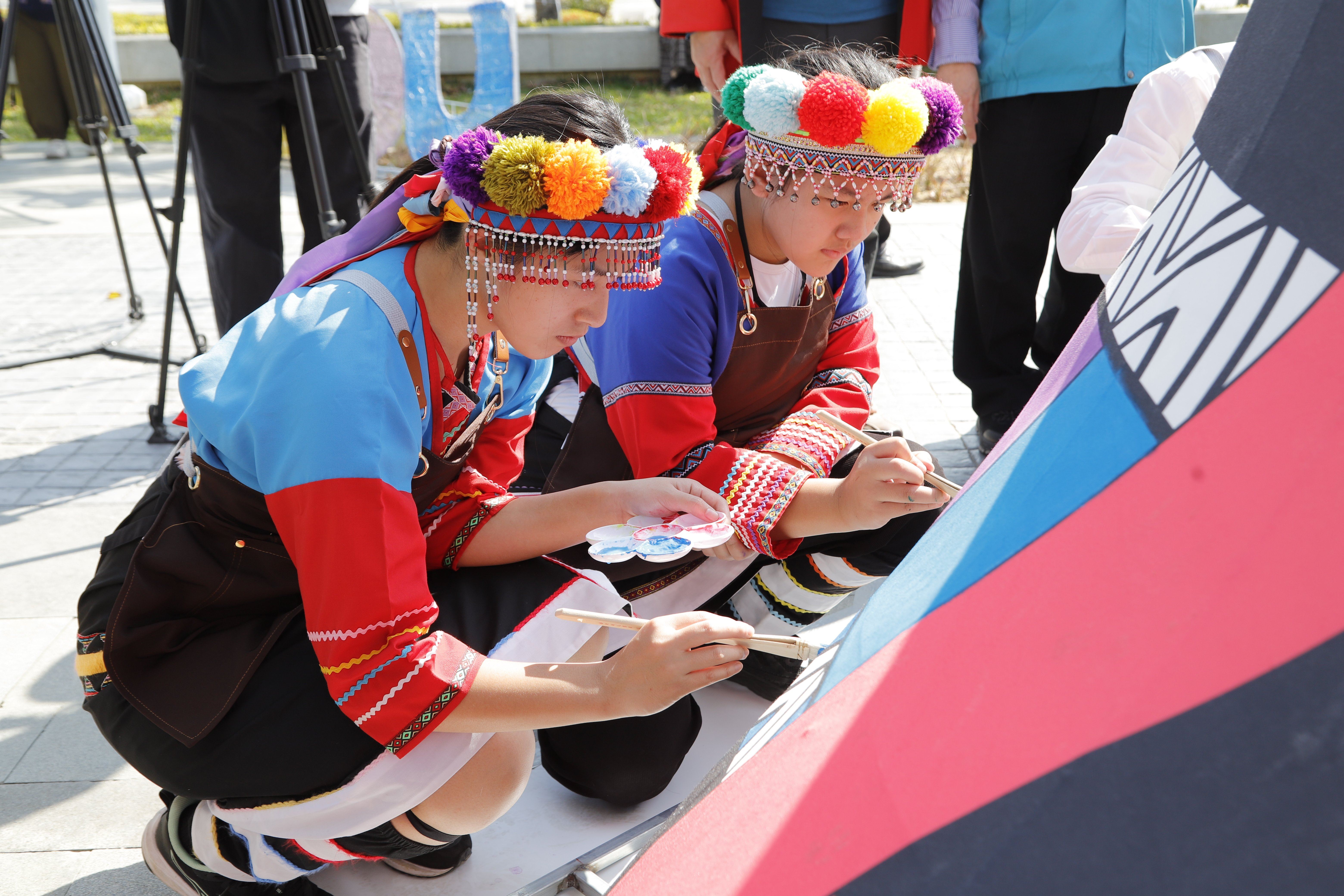 翁章梁隨後走入鄒族燈區「神之境」,與策展人鄭佩茜、族人孩童共同彩繪「迎賓之心」燈組,以充滿儀式感的創作,傳遞嘉義縣熱情歡迎全國遊客的心,同時凝聚原鄉對土地與燈會的認同感。