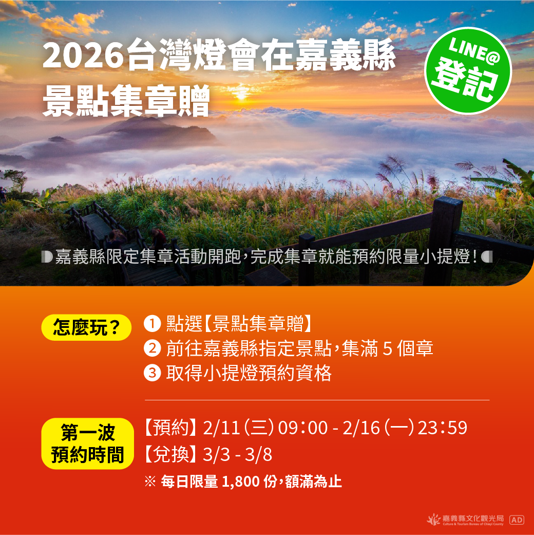 嘉義縣文化觀光局表示,本次集章活動共有115處景點,囊括特色觀光工廠、山林步道、在地文化景點,多元玩法一次滿足。遊客只要加入「慢遊嘉義官方LINE」,點選「主選單-景點集章贈」開始蒐集,前往指定景點並透過手機定位完成集章,累積滿5處景點,即可取得限量小提燈預約資格。不僅能蒐藏燈會紀念,還能深入認識嘉義縣的山林風光、文化特色與多樣旅遊景點,邊旅遊邊玩集章,趣味十足!
