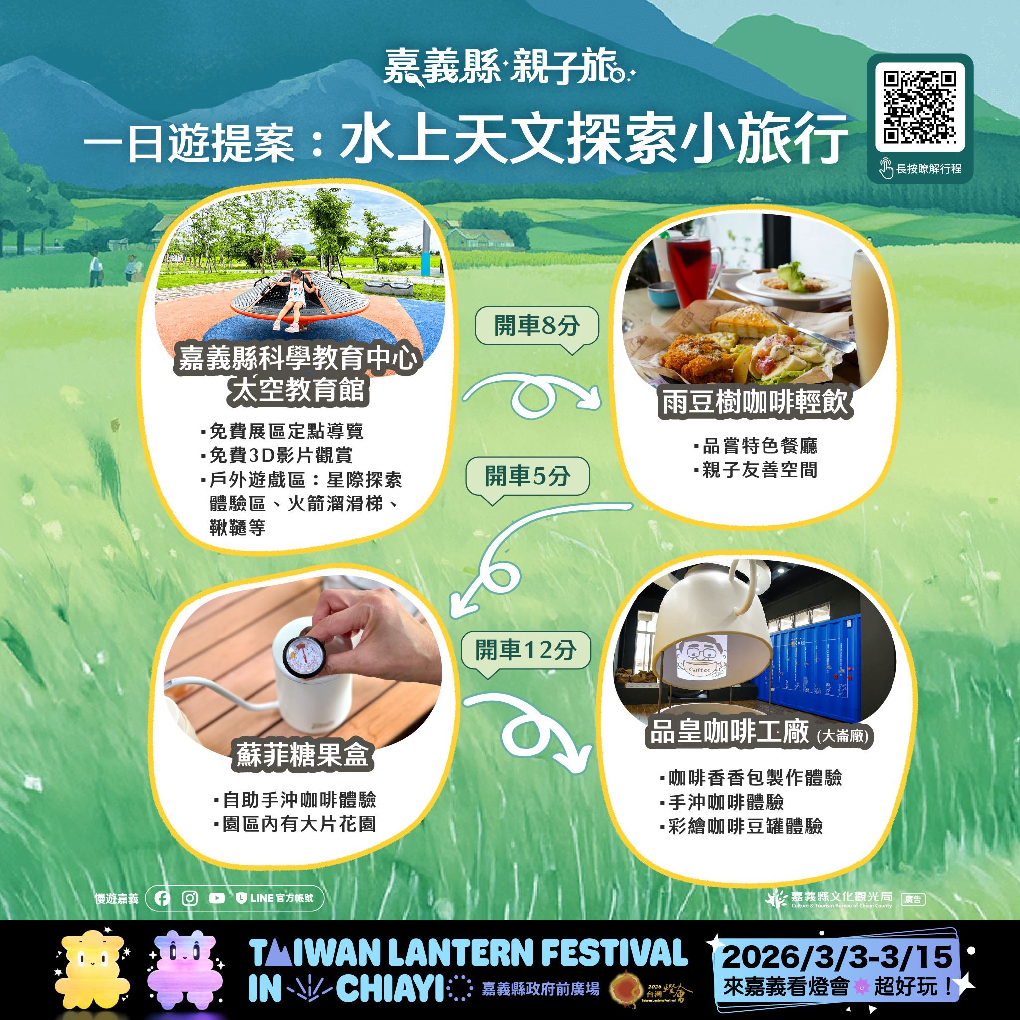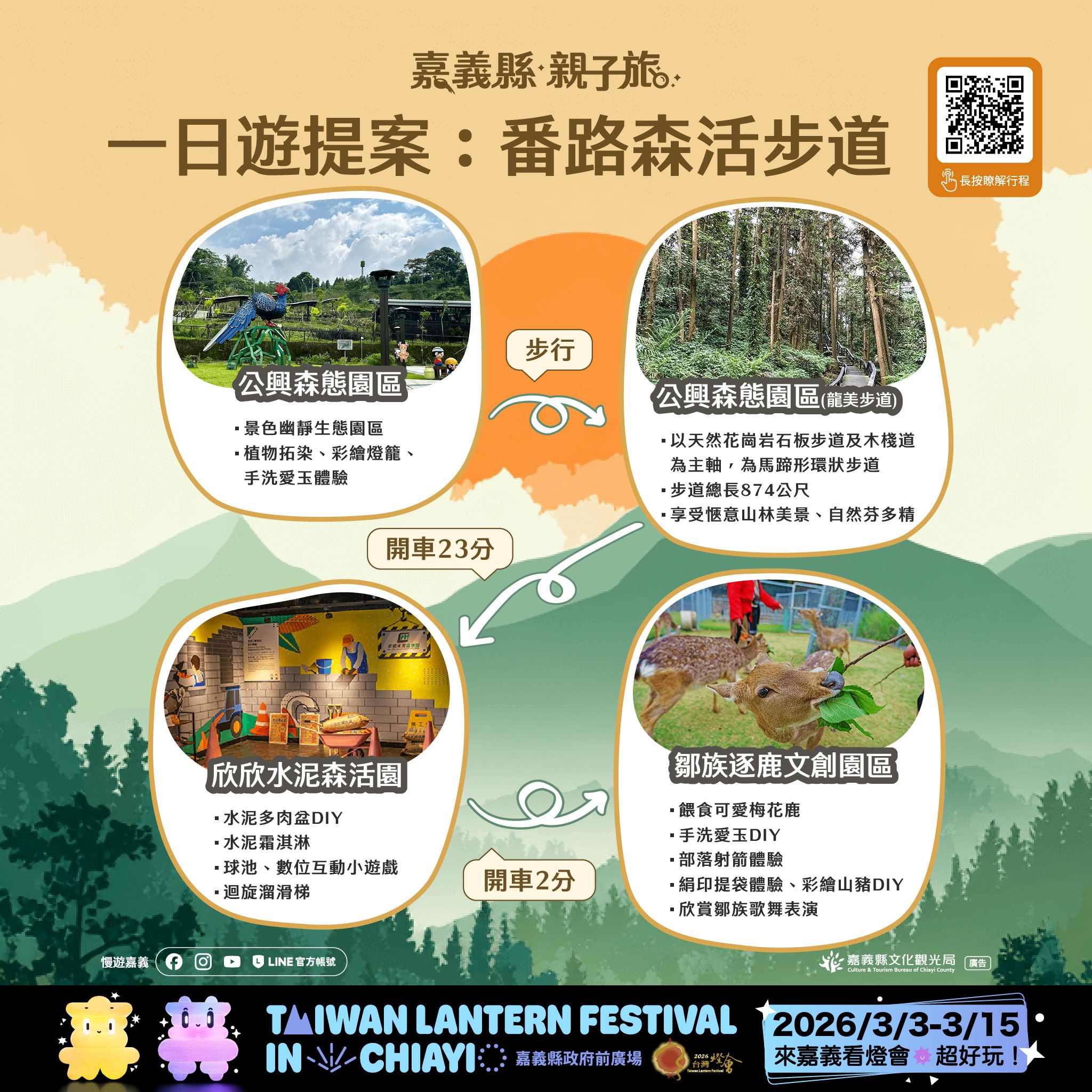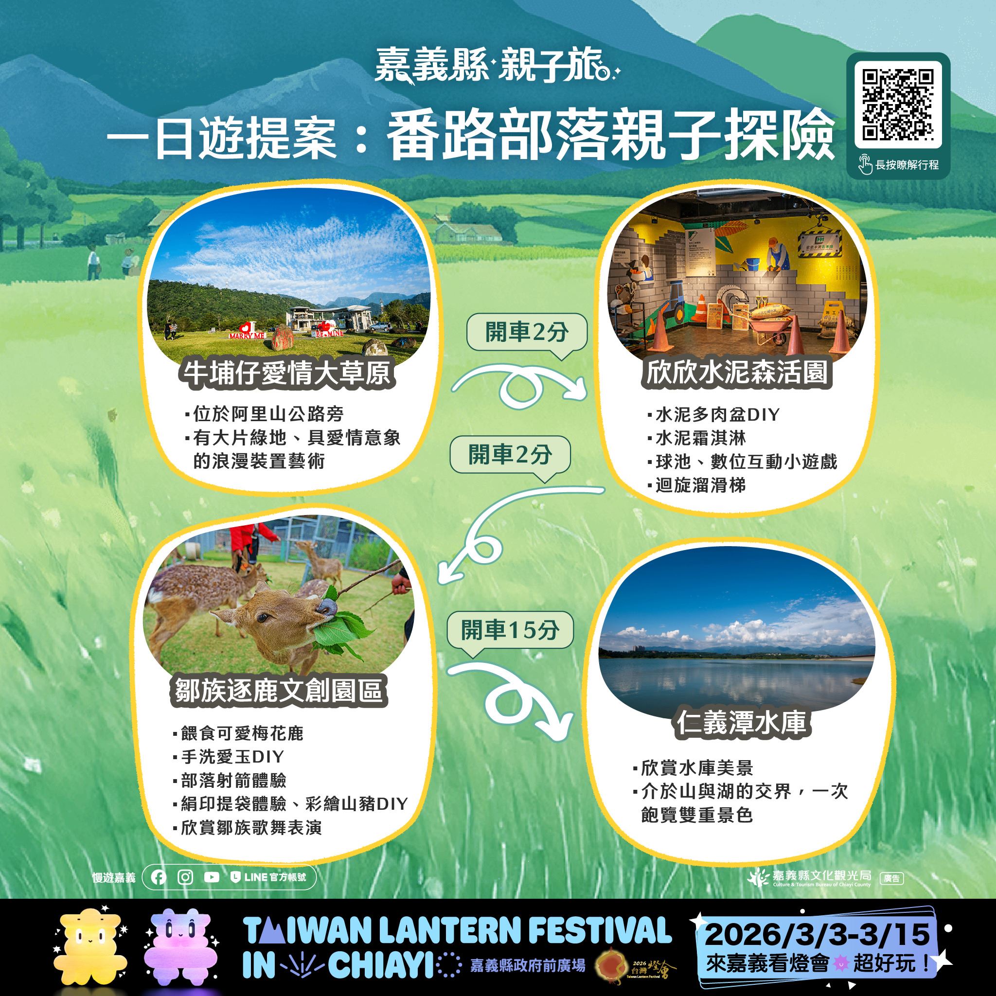 本次推出的28條賞燈親子遊程,涵蓋26條一日遊與2條二日遊路線,串聯嘉義縣多元景點與特色產業,遍及平原、海線與山線等鄉鎮,讓不同年齡層的孩子與家長,都能找到適合全家共遊的行程選擇。遊程內容橫跨文化體驗、自然生態、主題工廠、農村體驗及鄒族部落文化,白天深度走訪嘉義,夜晚再安排賞燈行程,讓旅遊節奏更輕鬆、回憶更豐富。