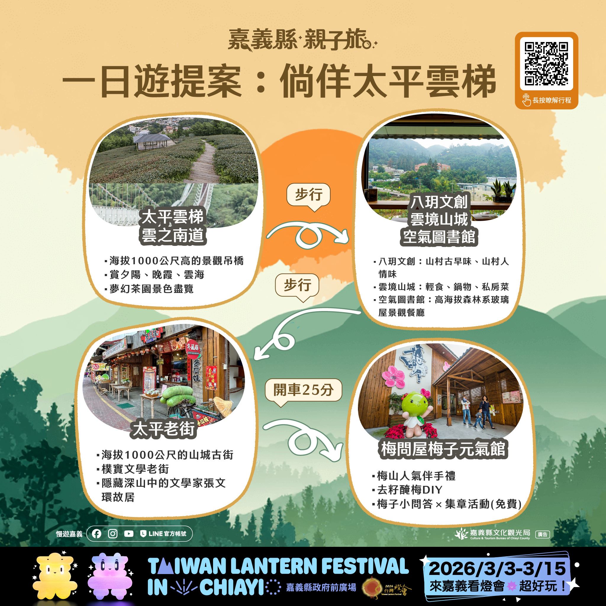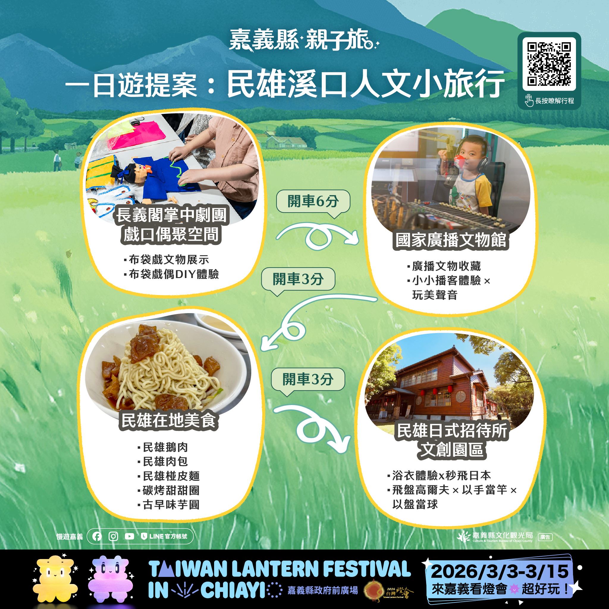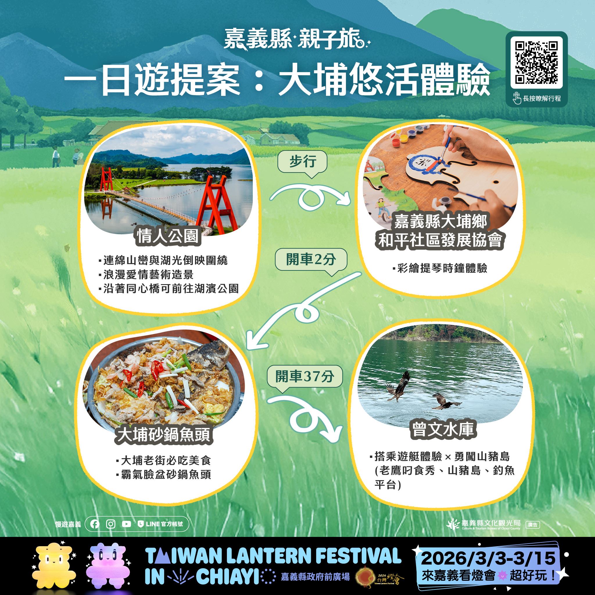 本次推出的28條賞燈親子遊程,涵蓋26條一日遊與2條二日遊路線,串聯嘉義縣多元景點與特色產業,遍及平原、海線與山線等鄉鎮,讓不同年齡層的孩子與家長,都能找到適合全家共遊的行程選擇。遊程內容橫跨文化體驗、自然生態、主題工廠、農村體驗及鄒族部落文化,白天深度走訪嘉義,夜晚再安排賞燈行程,讓旅遊節奏更輕鬆、回憶更豐富。