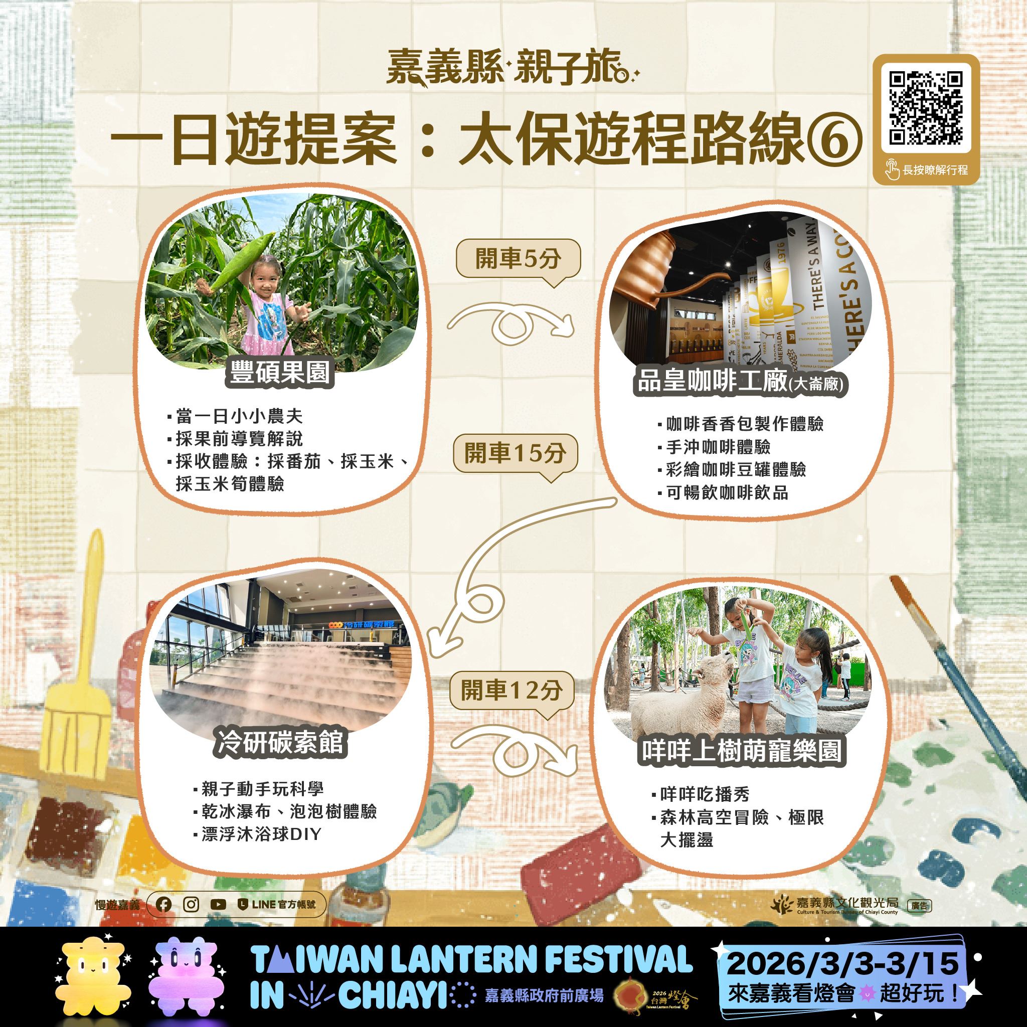 隨著2026台灣燈會在嘉義將於3月3日至3月15日盛大登場,文觀局特別規劃太保市多條親子路線,串聯故宮南院、蒜頭糖廠、文創聚落、主題工廠及萌寵樂園,提供多處親子友善場域,適合全家同遊。