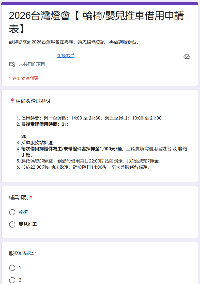 2026台灣燈會導入「線上QR Code登記系統」進行輪椅及嬰兒推車借用申請。民眾僅需透過手機掃碼即可快速完成流程,展現縣府運用科技落實平權服務的決心。
