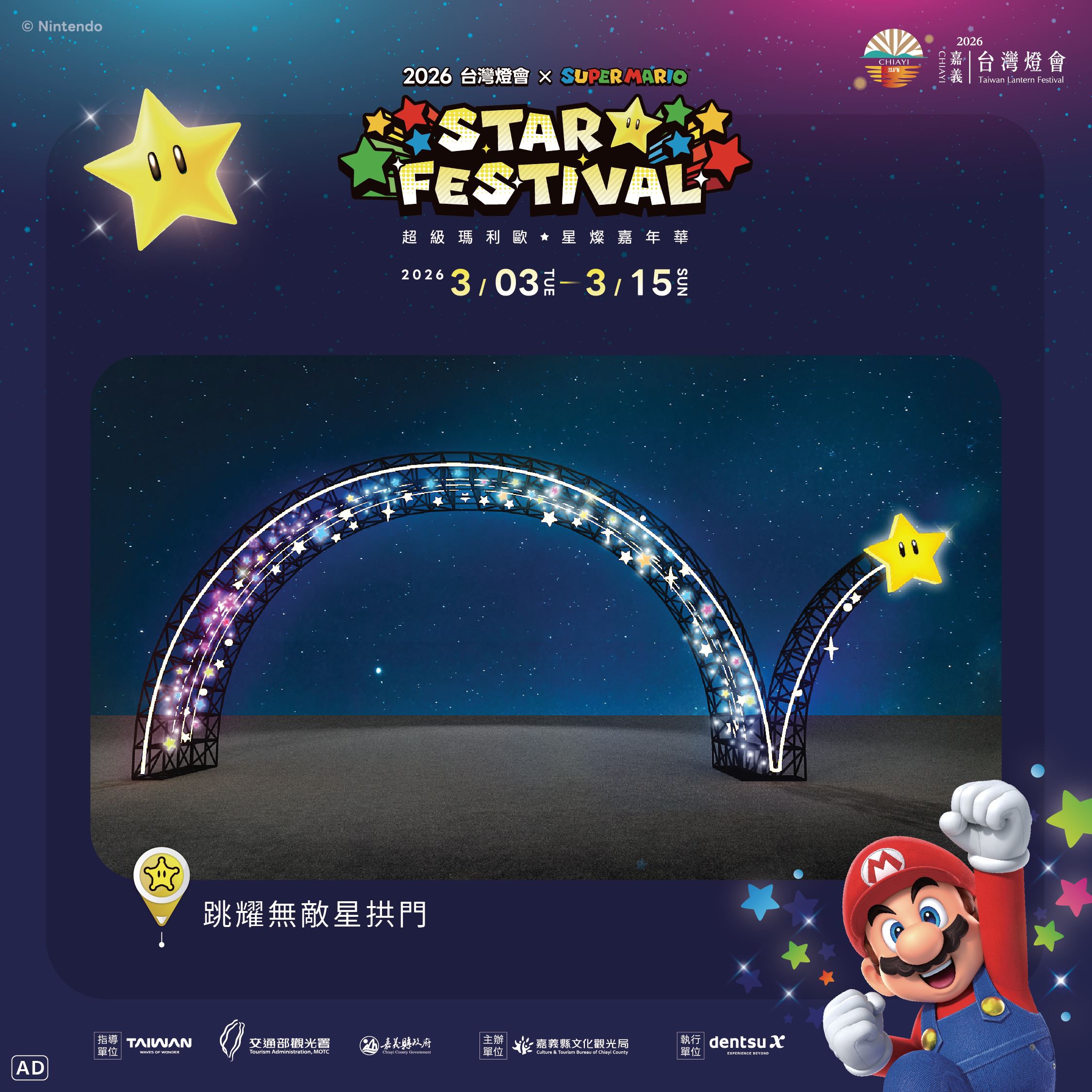 「2026台灣燈會 × 超級瑪利歐・星燦嘉年華」以《超級瑪利歐》系列角色與經典元素為整體設計主題,並以跳躍的「無敵星」作為串聯大小燈區的視覺主軸,搭配星星元素與燈光配置,讓參觀動線在燈區中自然延伸與展開。邀請大家走進燈區依照自己喜歡的步調,享受一場充滿樂趣與驚喜的台灣燈會。