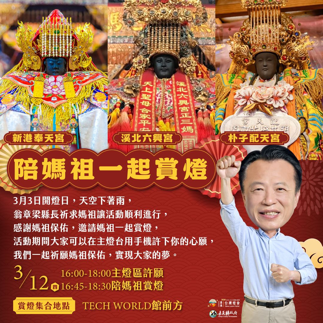 2026台灣燈會持續在嘉義展出,嘉義縣政府將於3月12日舉辦「陪媽祖一起賞燈」活動,邀請民眾與媽祖一同走入燈區,共同感受燈會璀璨燈景與熱鬧氛圍。