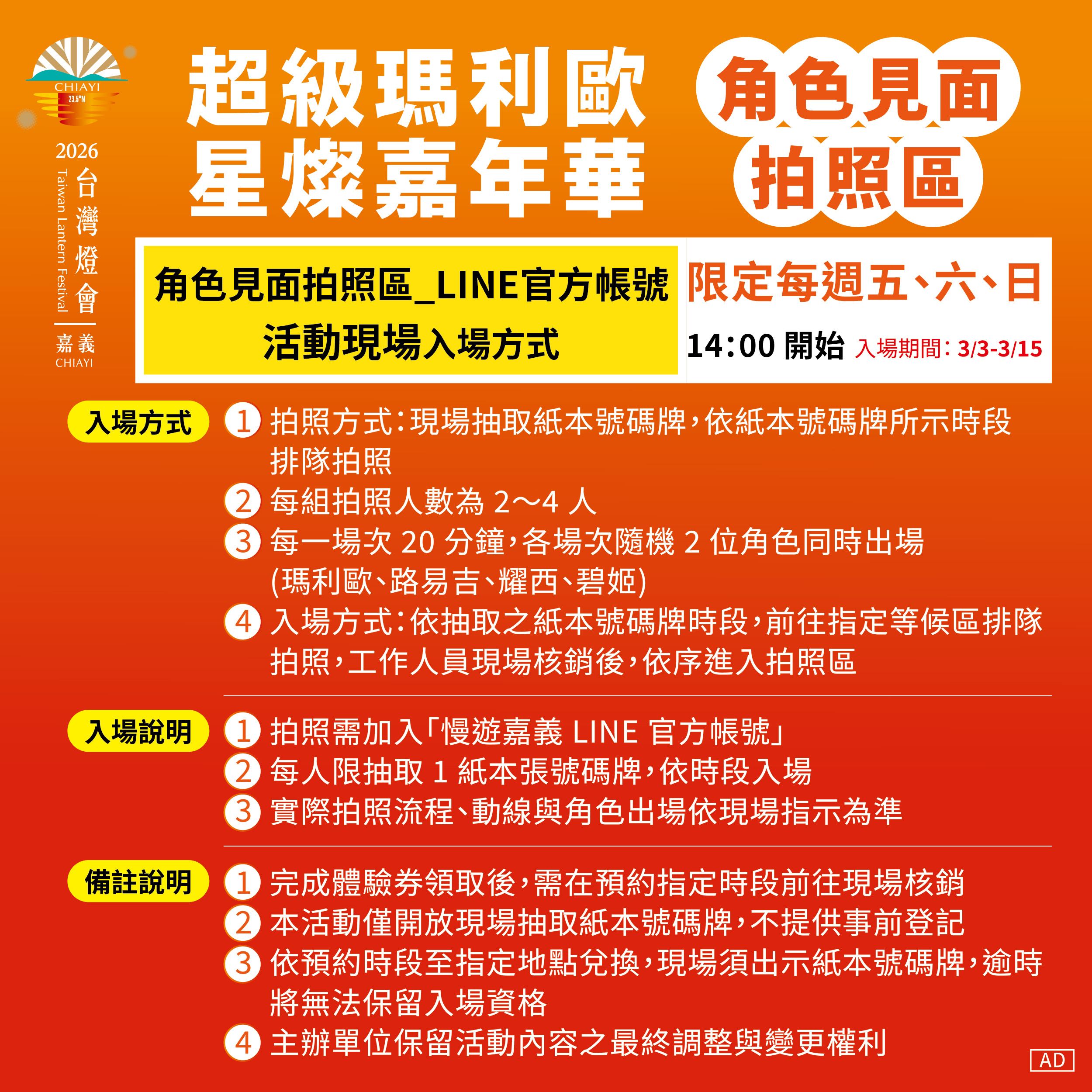 當日至燈區現場領取拍照券,於時段開始前至等候區排隊,再至「角色見面會」核銷拍照券入場,參與角色見面與合影互動。