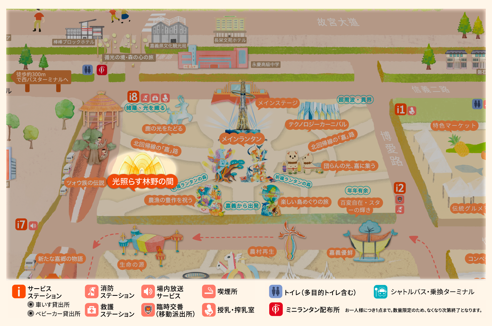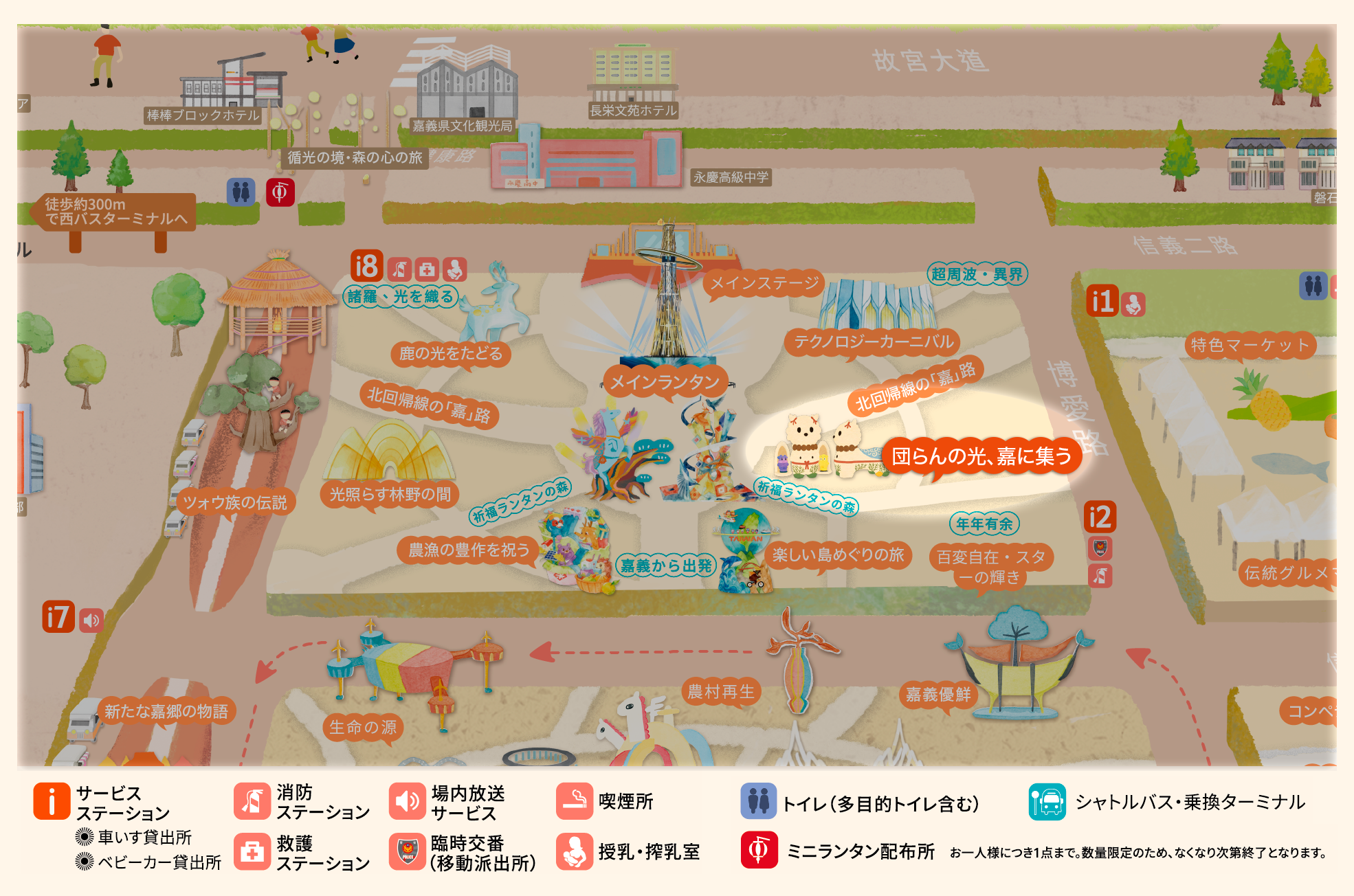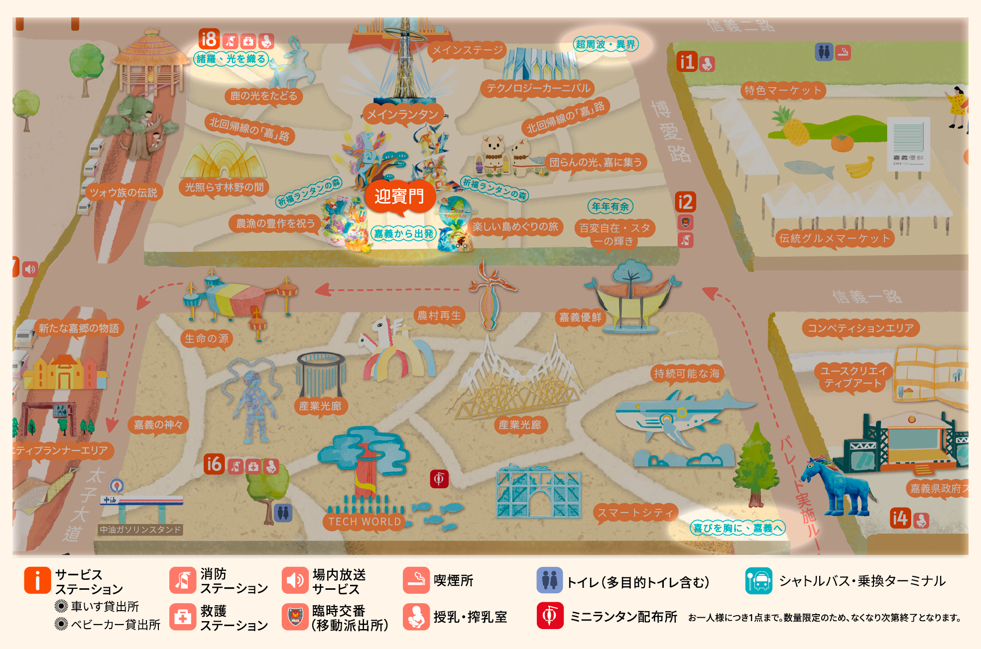 「祈光雲舞・栄慶豊収(光を祈り、雲が舞い、豊収を祝う)」をキュレーションの軸とし、「光躍台湾・点亮嘉義(台湾を照らし、嘉義を輝かせる)」というテーマを展開します。阿里山の自然景観、祈りの文化、そして都市の革新的なエネルギーからインスピレーションを得て、「雲海からの祈り、光で紡ぐ詩」を体現した没入型の光の空間を創り上げました。光の流動、色彩の層、そして律動的なリズムを通じて、メインランタン、祈りのランタン林、そして7つの主要なテーマエリアを繋ぎます。