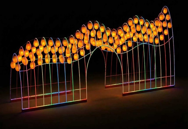 今回はキュレーターの蘇柏光(Su Po-kuang)氏と連携し、この転心瓶を核心的なイメージとして巨大化させ、現代的なライトアートと屋外空間デザインを融合させました。光と影を通じて、作品内の泳ぐ魚、水草、水紋などの要素を抽出し、古典的な文物を再解釈することで、没入型の光の体験を創出しています。