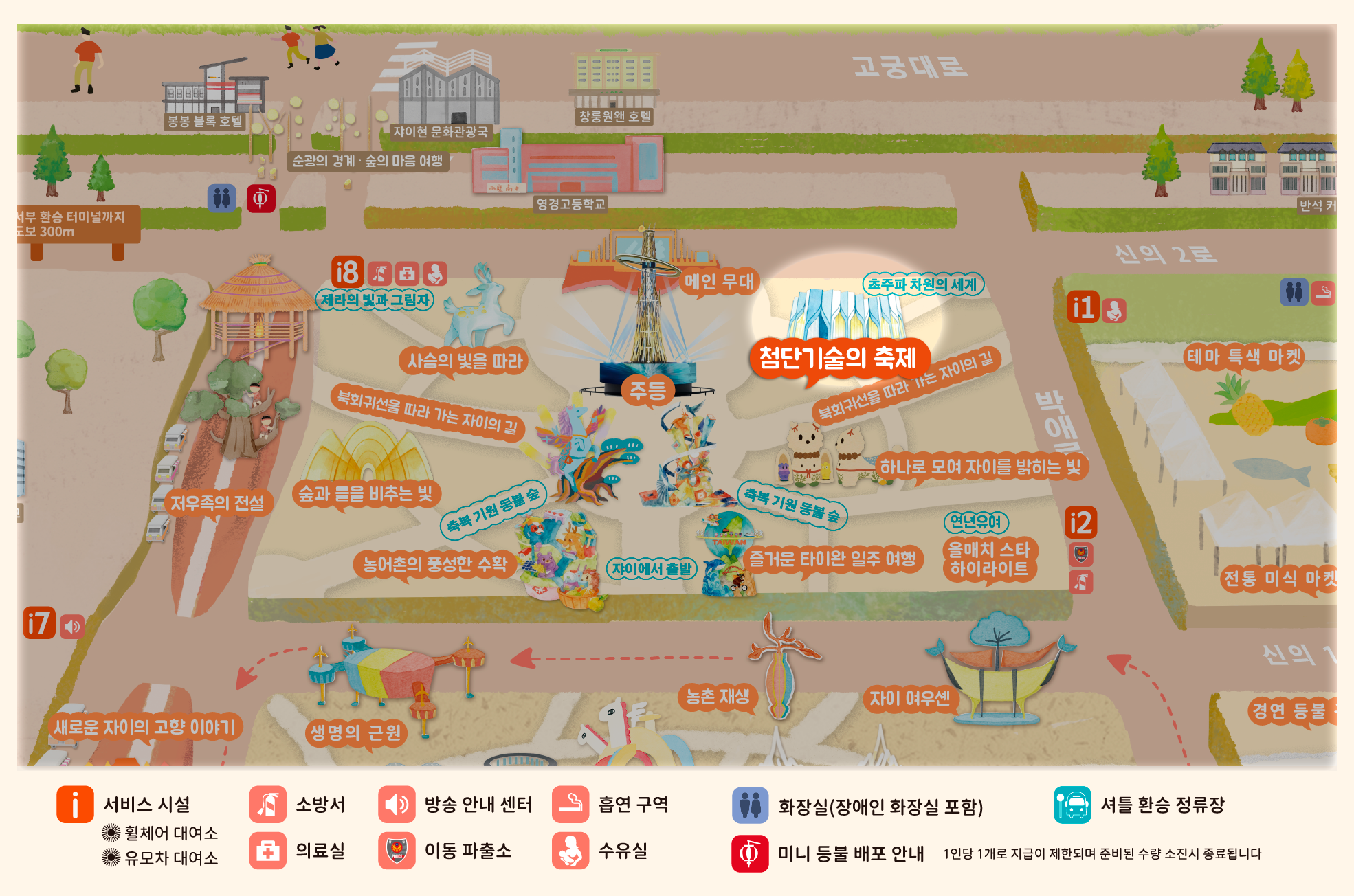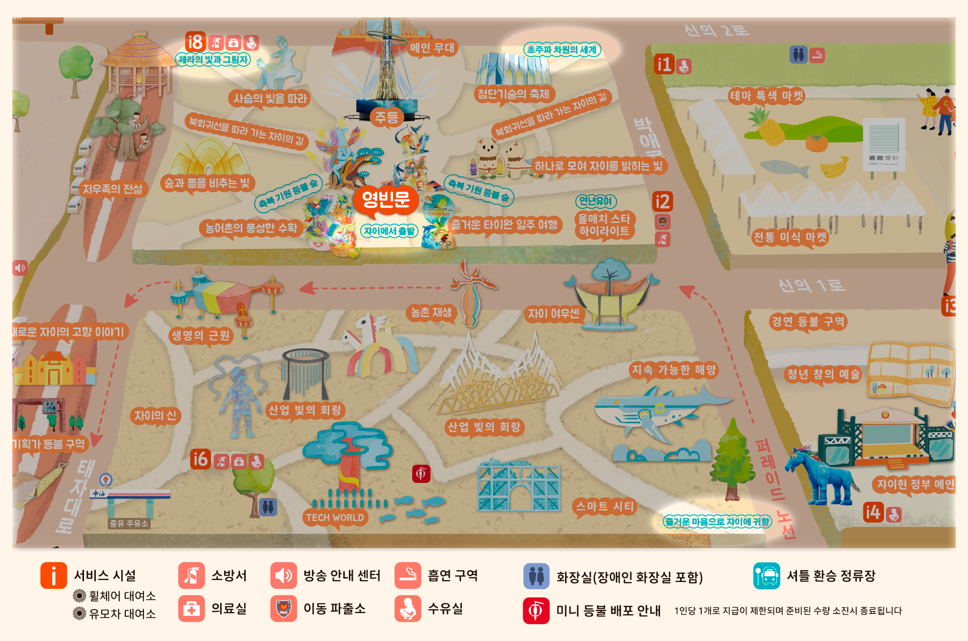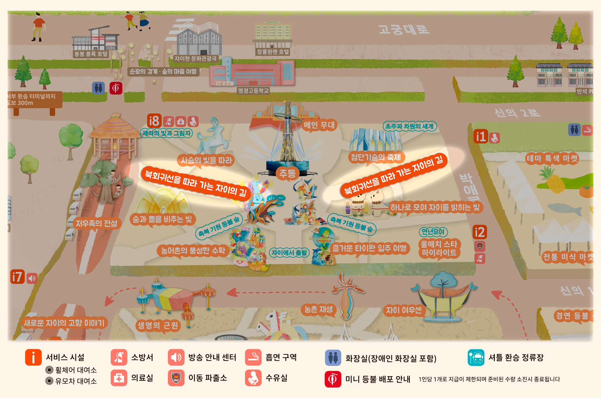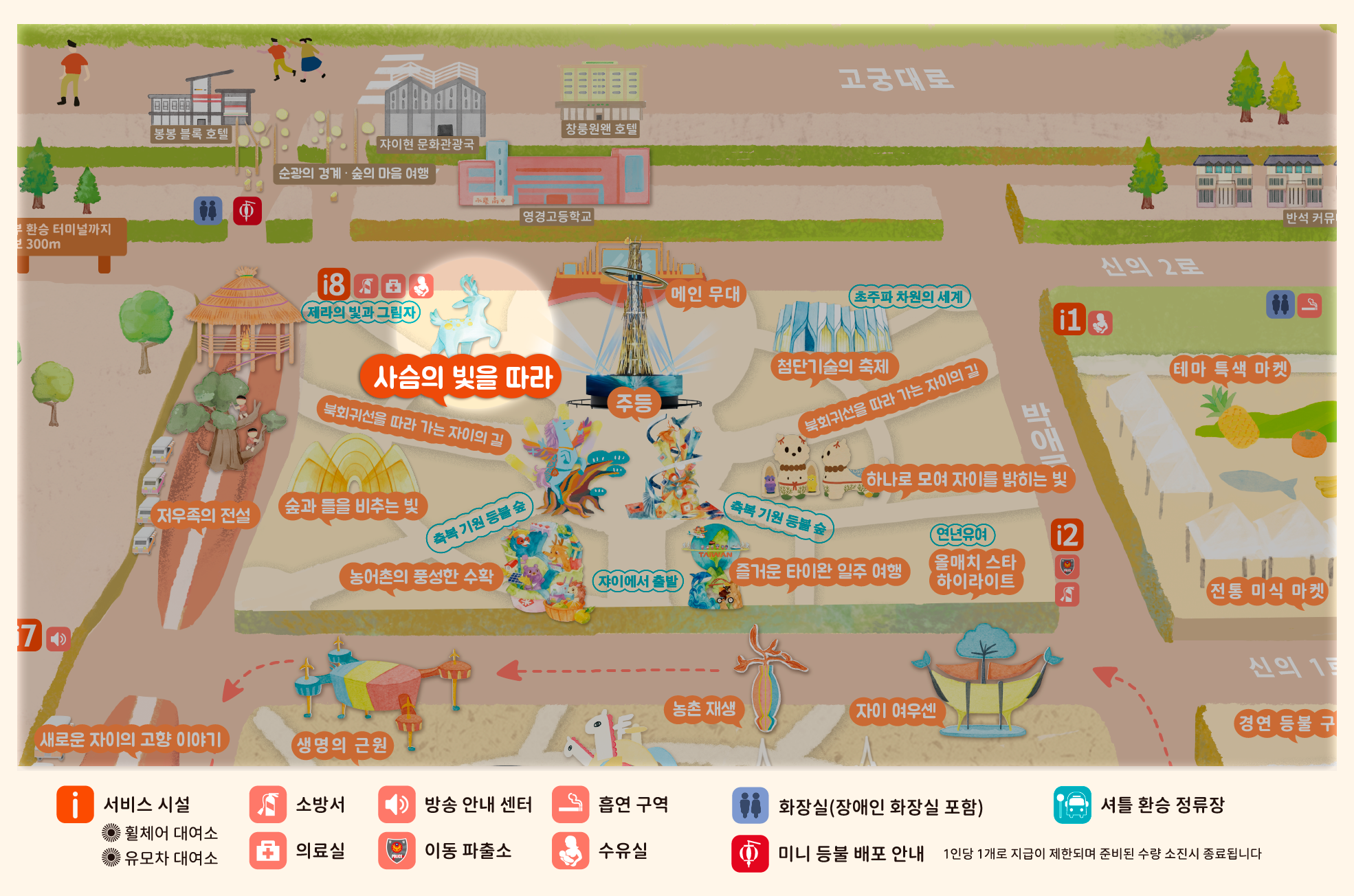 2026년 등불 축제는 **'광약대만, 점량자이(대만의 빛, 자이를 밝히다)'**를 주제로, '새로운 자이(New Chiayi)'를 통해 농공업 및 과학기술의 중심지로 지속 발전하는 자이의 비전을 제시하며 대만의 변화를 세계에 알립니다. 빛과 그림자 예술은 도시를 비추는 동시에 자이의 변혁과 창의적인 힘을 전달합니다.