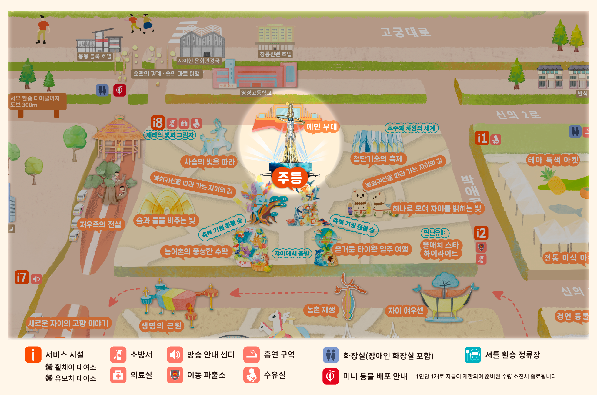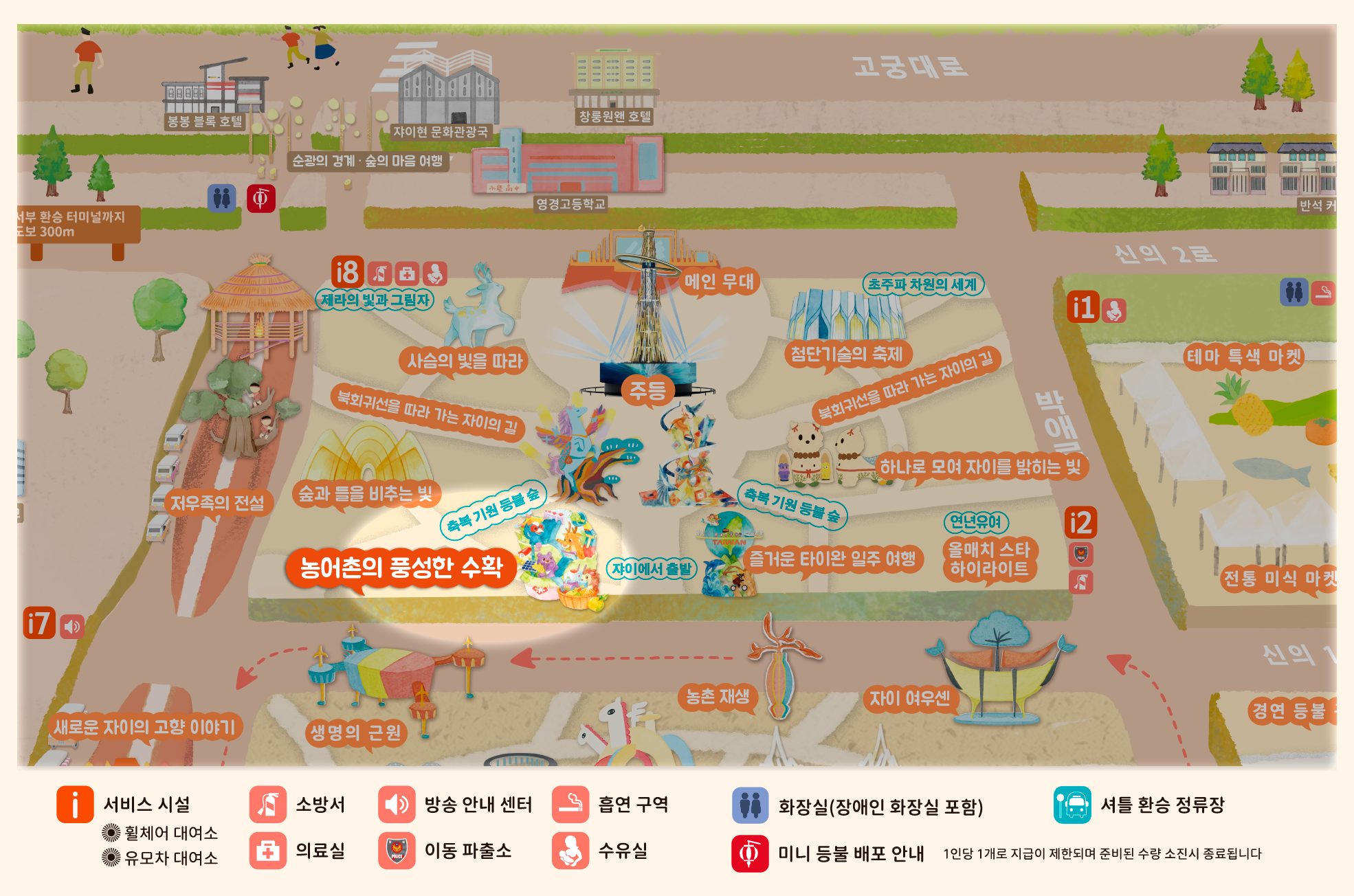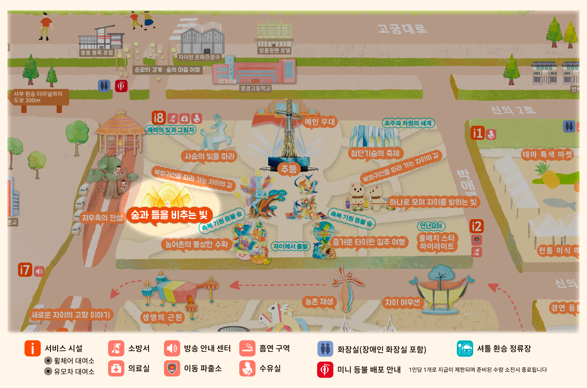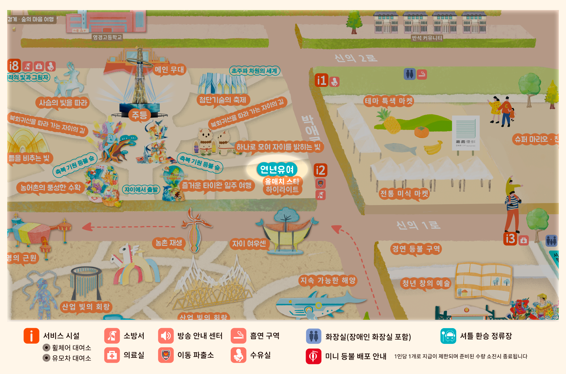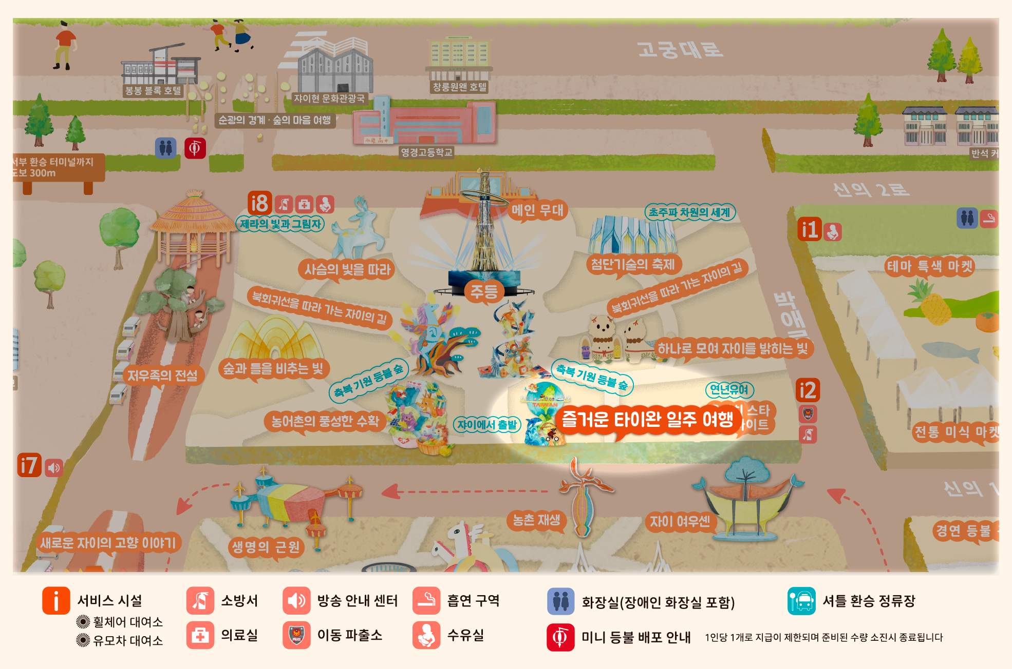 2026년 등불 축제는 **'광약대만, 점량자이(대만의 빛, 자이를 밝히다)'**를 주제로, '새로운 자이(New Chiayi)'를 통해 농공업 및 과학기술의 중심지로 지속 발전하는 자이의 비전을 제시하며 대만의 변화를 세계에 알립니다. 빛과 그림자 예술은 도시를 비추는 동시에 자이의 변혁과 창의적인 힘을 전달합니다.